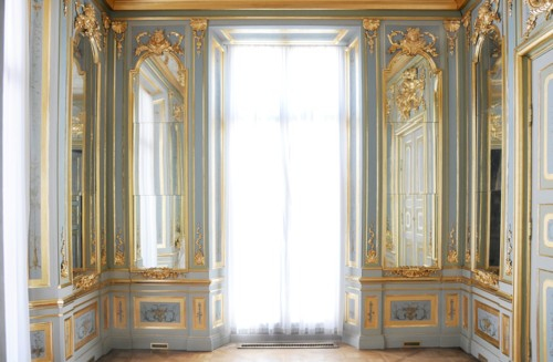 Przed konserwacją kolorystyka pomieszczenia ograniczała się do trzech barw: złota, jasnej szarości przemalowań drewnianych elementów boazerii i ciemnej zieleni tła sztukaterii.