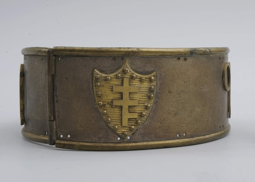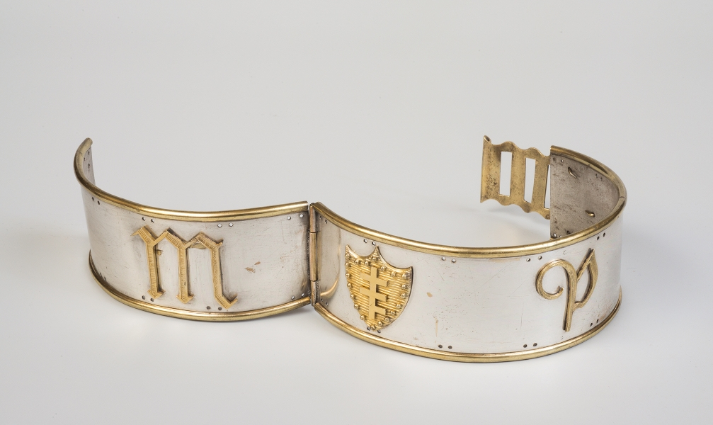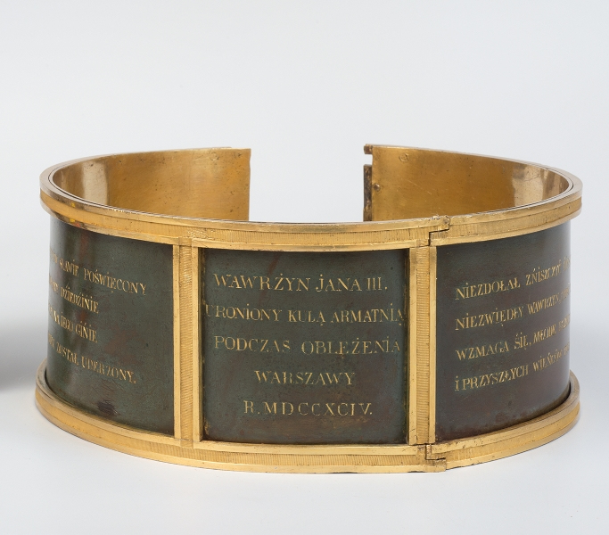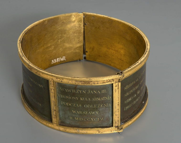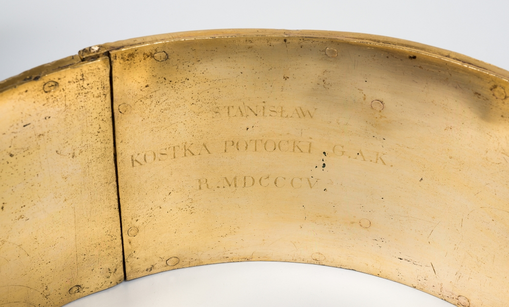 Posrebrzana obręcz, dekorowana herbem Potockich Pilawa oraz literami „M” i „P” (które, być może, odpowiadają Maurycemu Potockiemu, synowi Aleksandra Potockiego), również jest niekompletna – nie zachował się jeden z elementów zapięcia, co można rozpoznać po widocznych pustych otworach montażowych. Ciekawostką są także liczne otwory wzdłuż górnej i dolnej krawędzi obiektu ułożone po dwa obok siebie – sugerują pierwotne istnienie dodatkowych fragmentów. Zakres prac przewidzianych w tej konserwacji nie obejmował rekonstrukcji brakujących elementów.