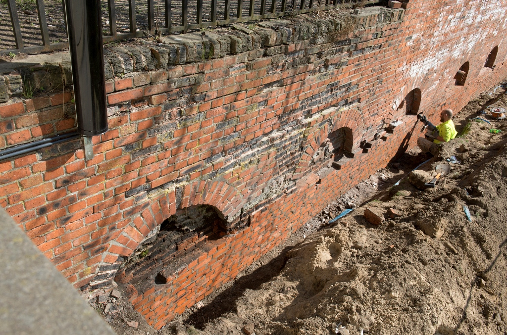 - zabezpieczenie powierzchni muru przed wpływem wilgoci i związków w niej zawartych (w szczególności dotyczące osłabionych spoin lub ich braku w obszarze najstarszego wątku muru oraz słabej struktury cegieł w części nowej),
