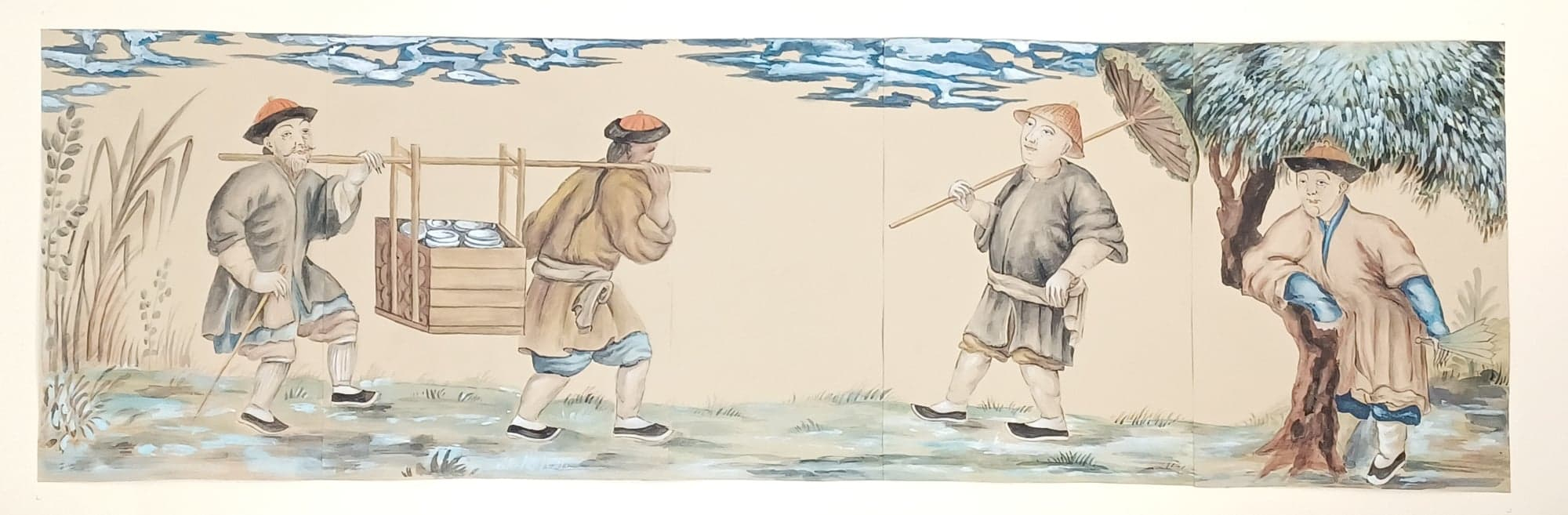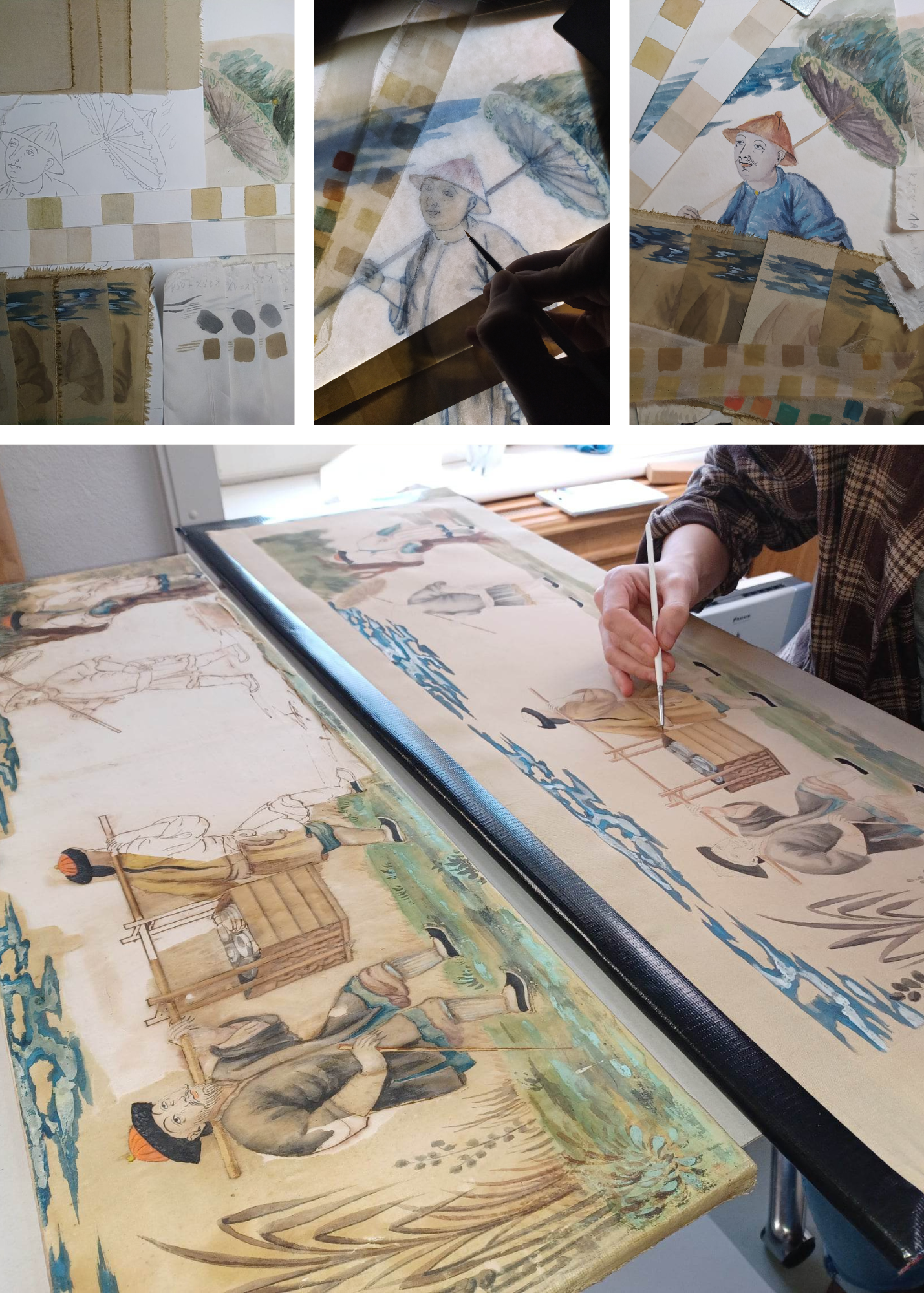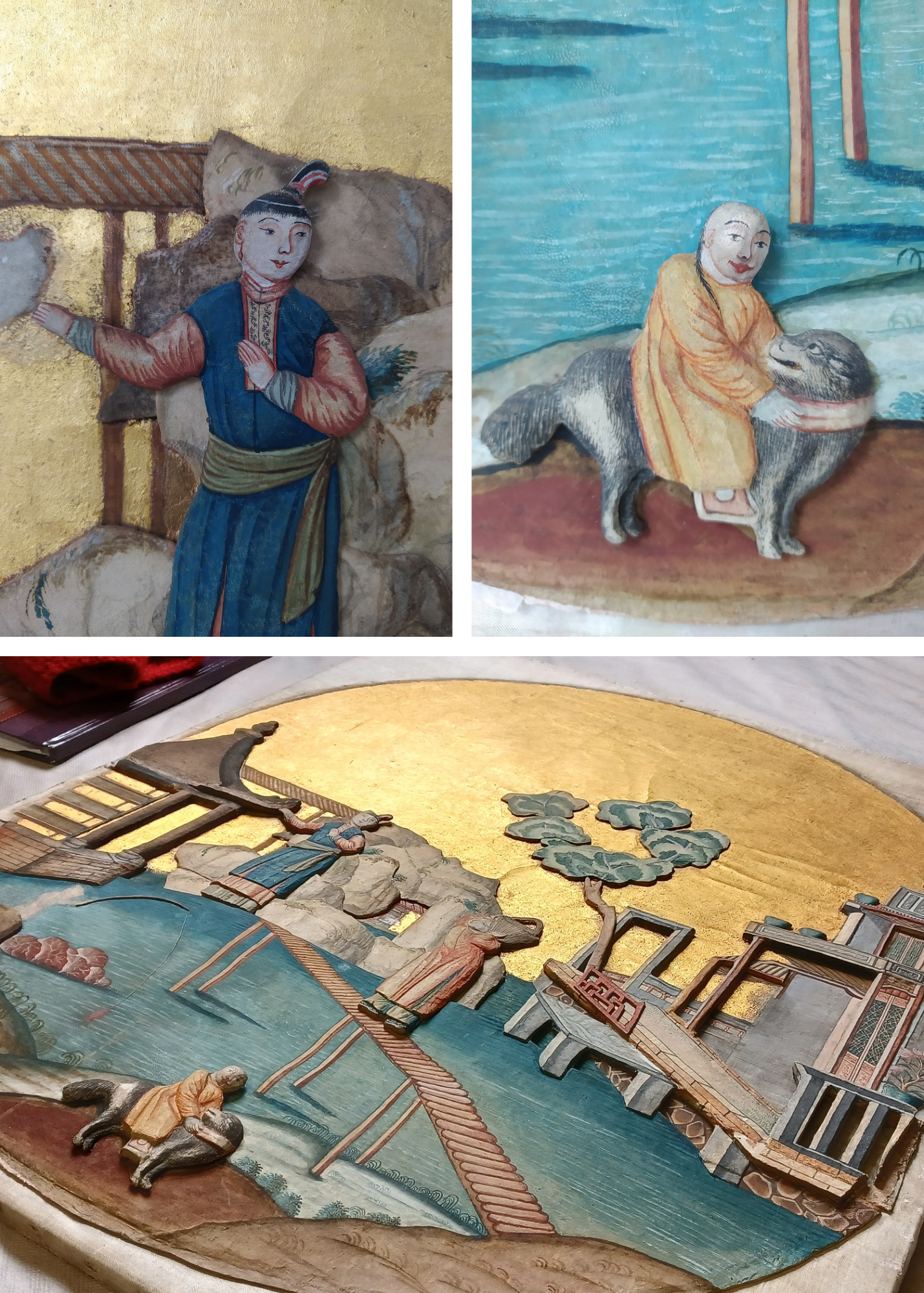 Oryginalne malowidło ze sceną rodzajową, pierwotnie wprawione w dolny otwór drewnianego panelu, nie nadaje się do ekspozycji. Jego jedwabne podłoże jest bardzo kruche, a ubytki znaczne. W związku z tym, konserwatorzy wykonali jego wierną kopię. Obraz powstał najprawdopodobniej w Europie, o czym świadczy stylistyka dzieła, odzwierciedlająca wyobrażenie artystów europejskich o Dalekim Wschodzie. W wyniku szczegółowych badań konserwatorskich uzyskano kluczowe informacje o strukturze obiektu, rodzaju użytej farby i pigmentach, tkaninach czy rodzaju drewna krosna. Przed namalowaniem kopii niezbędne było wykonanie wielu prób z wykorzystaniem nowej wiedzy nt. zabytku. W rezultacie powstały tzw. „próbniki”, na podstawie których można było stworzyć kopię dopełniającą eksponowany na wystawie panel.
