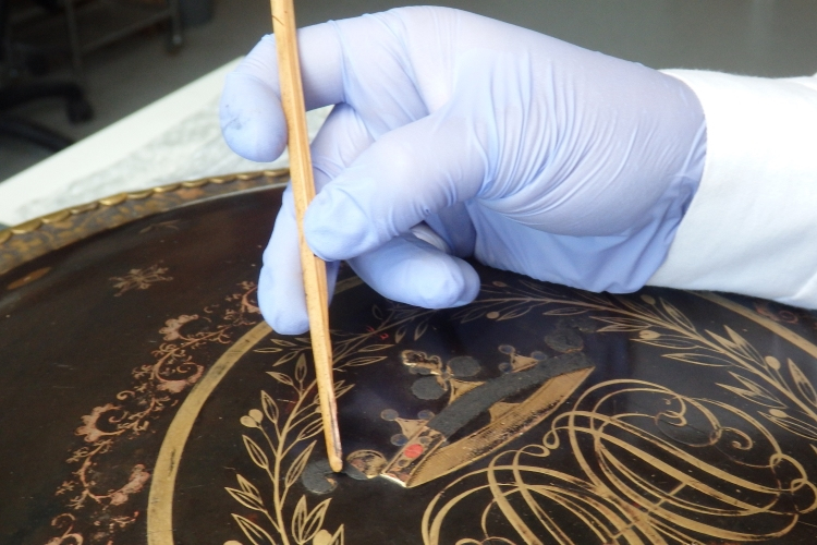 Podczas konserwacji usunięto europejskie lakiery dodane podczas wcześniejszych prac, odsłaniając dobrze zachowaną powierzchnię oryginalnej czarnej laki z całą gamą kolorów związanych z naturalną patyną powstałą z wiekiem – od jasnobrązowych i czerwonych refleksów po ciemnobrązowe i czarne odcienie. Największym wyzwaniem, częściowo niemożliwym do wykonania, było zmycie ukrytych pod lakierami żywicznymi śladów po odchodach owadów, bez zniszczenia ornamentów kwiatowych nieodpornych na rozpuszczalniki.