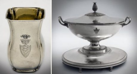 Po lewej: Kubek, Polska, Warszawa, Karol Filip Malcz, przed 1850 srebro kute, grawerowane. Po prawej: Waza owalna Francja, Paryż, Martin Guillaume Biennais, 1793-1819 srebro odlewane, cyzelowane, grawerowane, z nakładaną dekoracją plastyczną