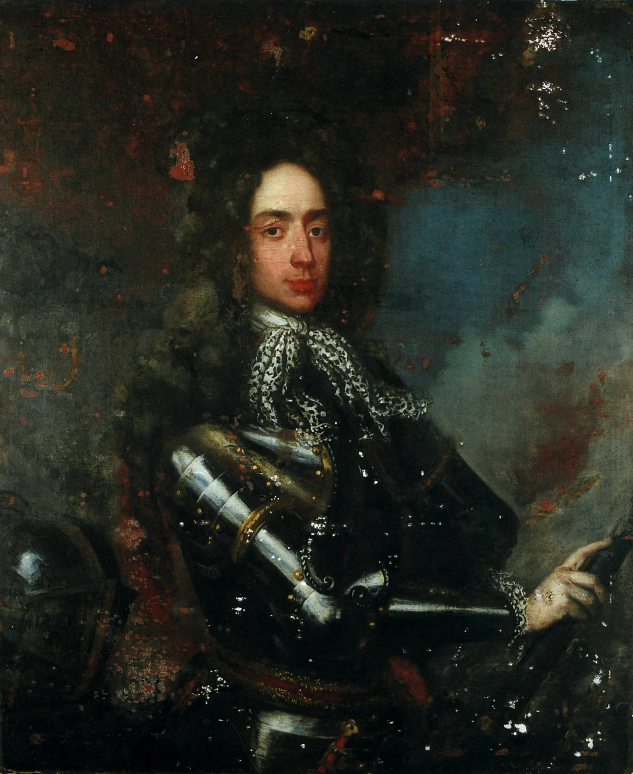 Obraz od 1962 r. eksponowany jest w Bibliotece Króla. Przedstawia młodzieńca w reprezentacyjnym stroju. Po szczegółowych oględzinach w promieniach UV i promieniach podczerwonych, które potwierdziły istnienie rozległych retuszy i przemalowań, został poddany konserwacji. Usunięcie przemalowań uwidoczniło pierwotną kolorystykę i kompozycję obrazu. Zostały odkryte: scena bitewna (w prawym dolnym rogu), odmienna od obecnej kolorystyka nieba i inny kształt hełmu. Na podstawie zachowanych fragmentów oryginału oraz autorskiego rysunku (badania w podczerwieni) zostało zrekonstruowane niebo, fragment peruki i scena bitewna.