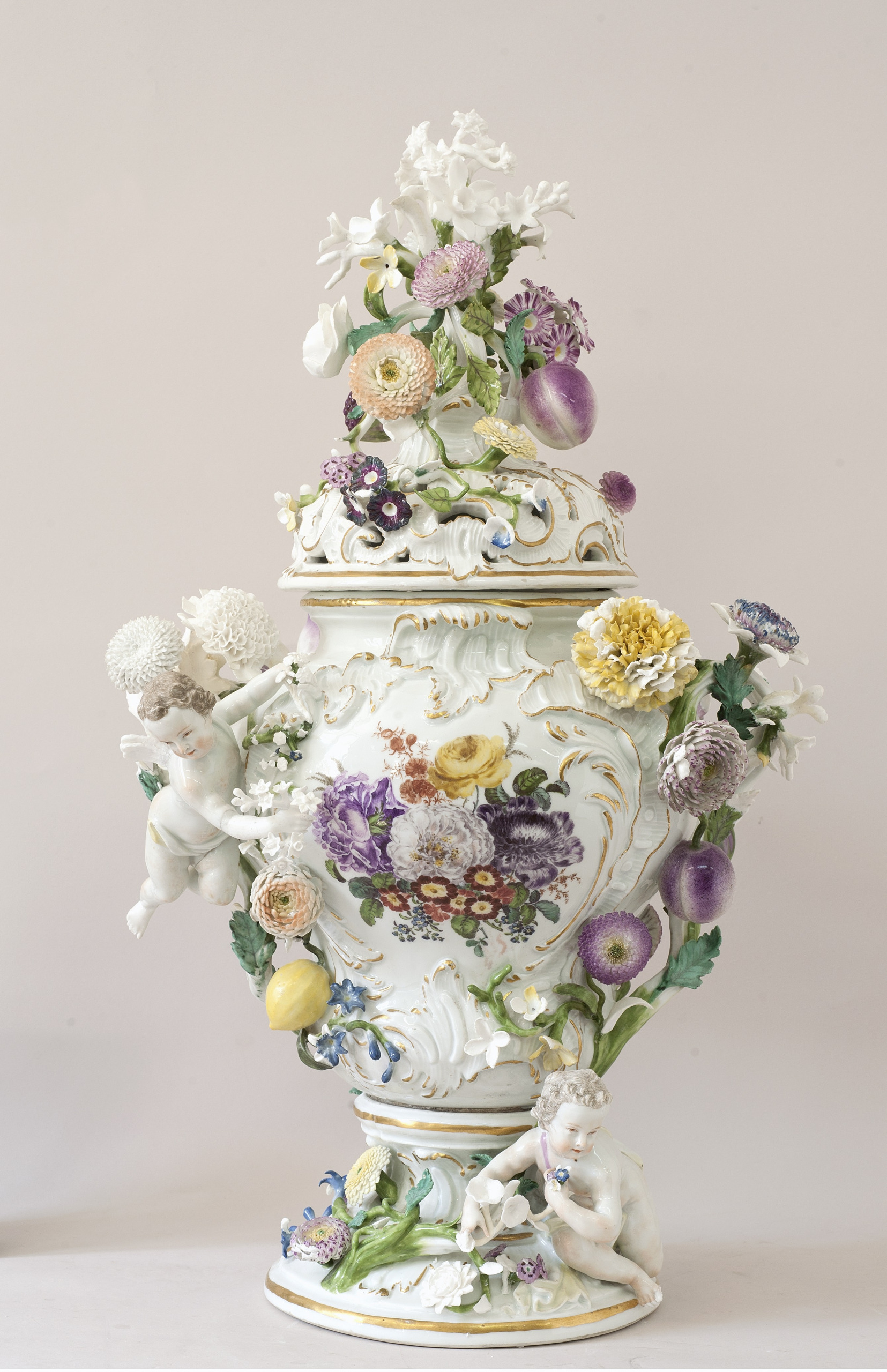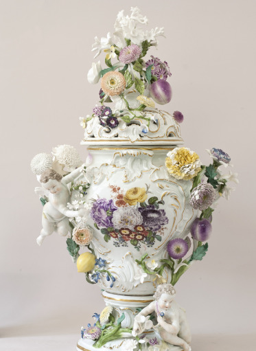 A set of five vases made of Meissen porcelain amazes viewers with its intricacy and craftsmanship. The vases are decorated with raised flowers and fruits and openwork grilles. Such dishes were placed in representative interiors on the cornices of fireplaces or tables. Their creator is most likely the famous sculptor and designer Johann Joachim Kändler.