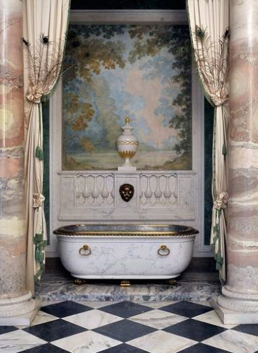 A green marbled bathtub stands on six gilded lion paws. Made of tin, the interior is enclosed in a gold-plated copper frame with lace. Above the bathtub hangs a carved lion's head, from which water flowed. The bathtub testified to the worldly tastes of the owner and her love of luxury.