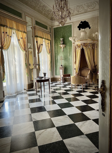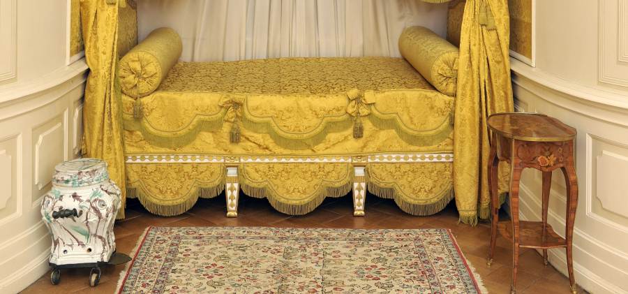 In the 18th century, the bathroom was a kind of salon, which, in addition to bathing, was also used for meetings, games, and relaxation. Visitors' eyes are immediately caught by the bath set on six lion paws located in a decorative niche, as well as a chaise longue with a canopy with ostrich feathers, evidence of the recreational function of the room.