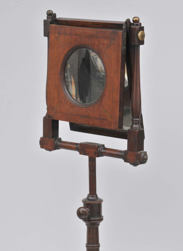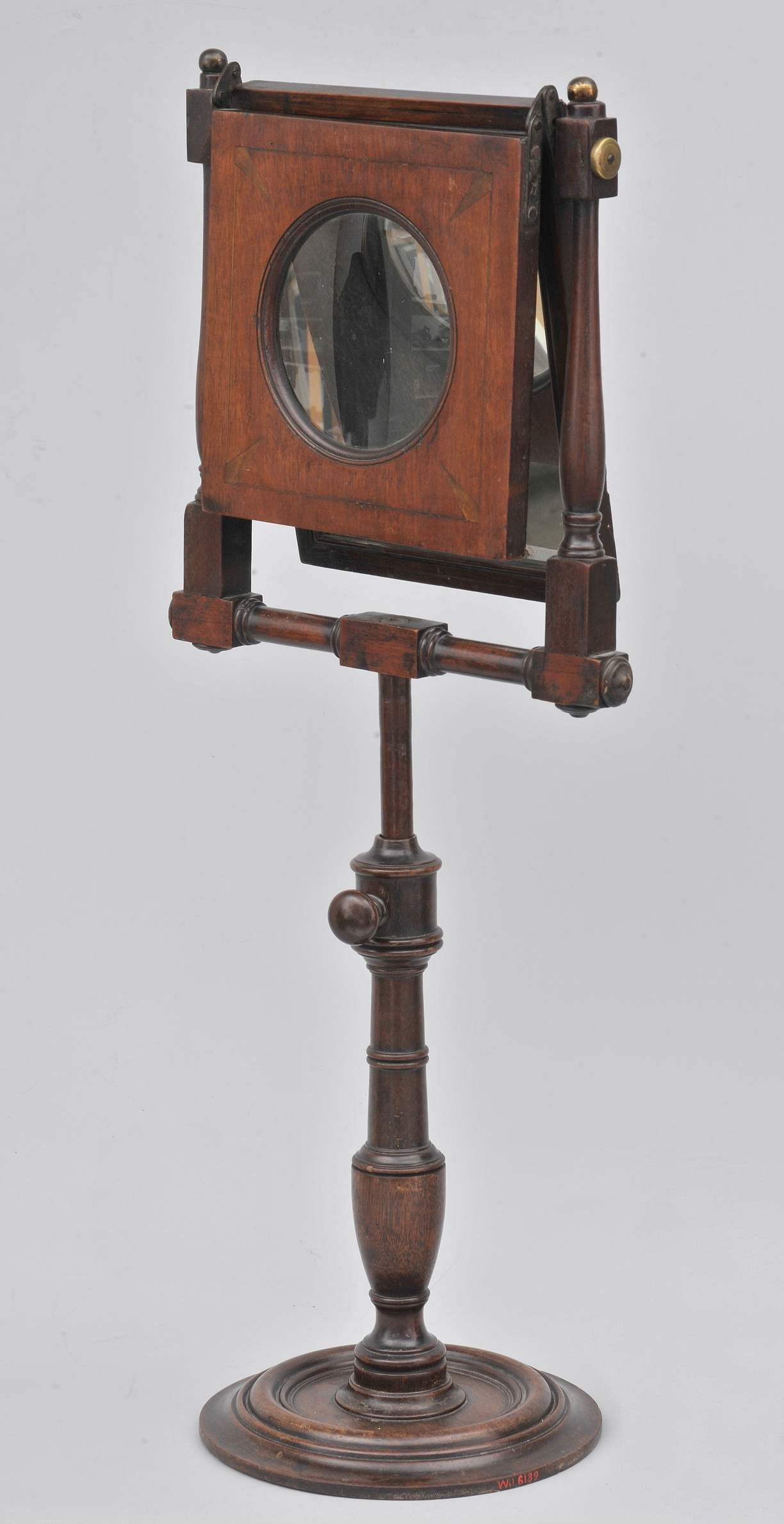 At the turn of the 18th and 19th centuries, this was an extremely popular optical instrument. Thanks to the placement of the lens and mirror, the observed drawing gives a spatial, three-dimensional impression. Specially prepared illustrations usually depicted famous buildings, gardens or squares. The device reminds viewers of the era of the Grand Tour – grand educational trips around Europe, from which souvenir engravings were imported.