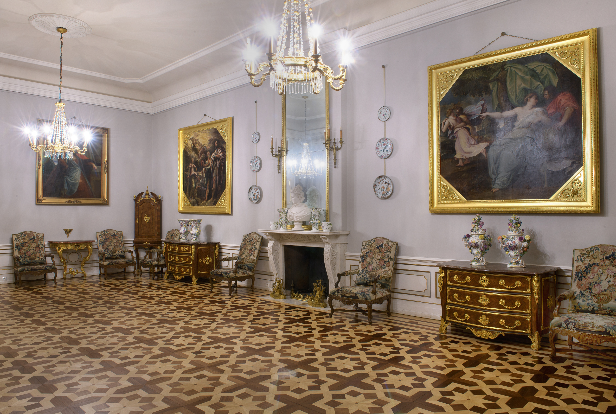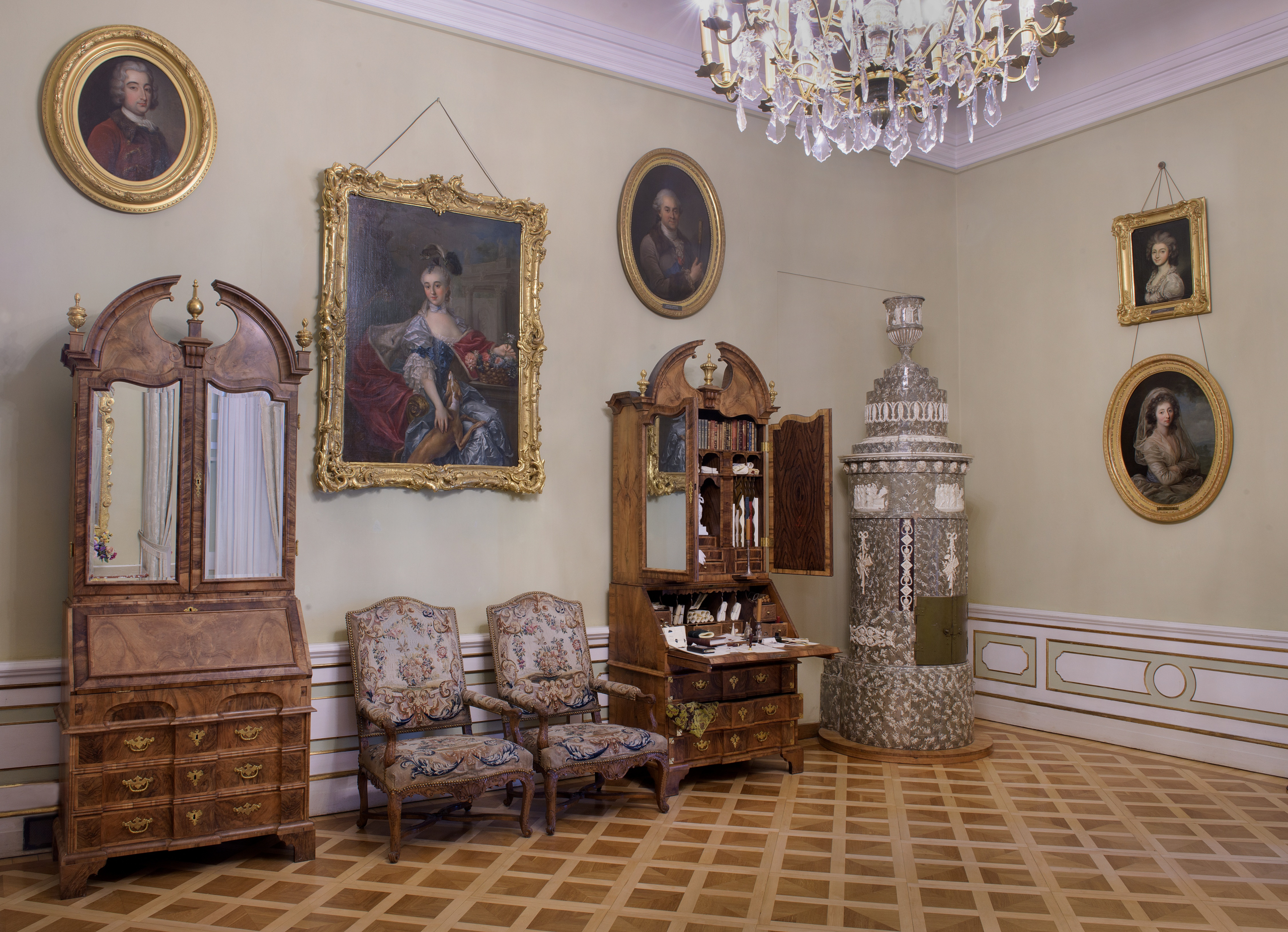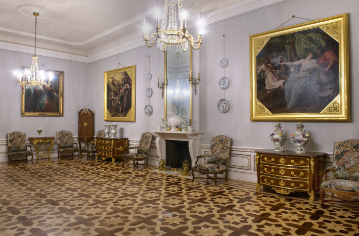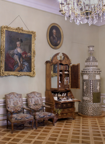 The furnishings and decoration are maintained in the style of 18th-century interiors. Here, visitors can admire upholstered furniture with decorations depicting vases with flowers from the French manufactory Abusson, English secretary desks from the early 18th century, English mirrors, and vases decorated with flowers from the Meissen porcelain manufactory.