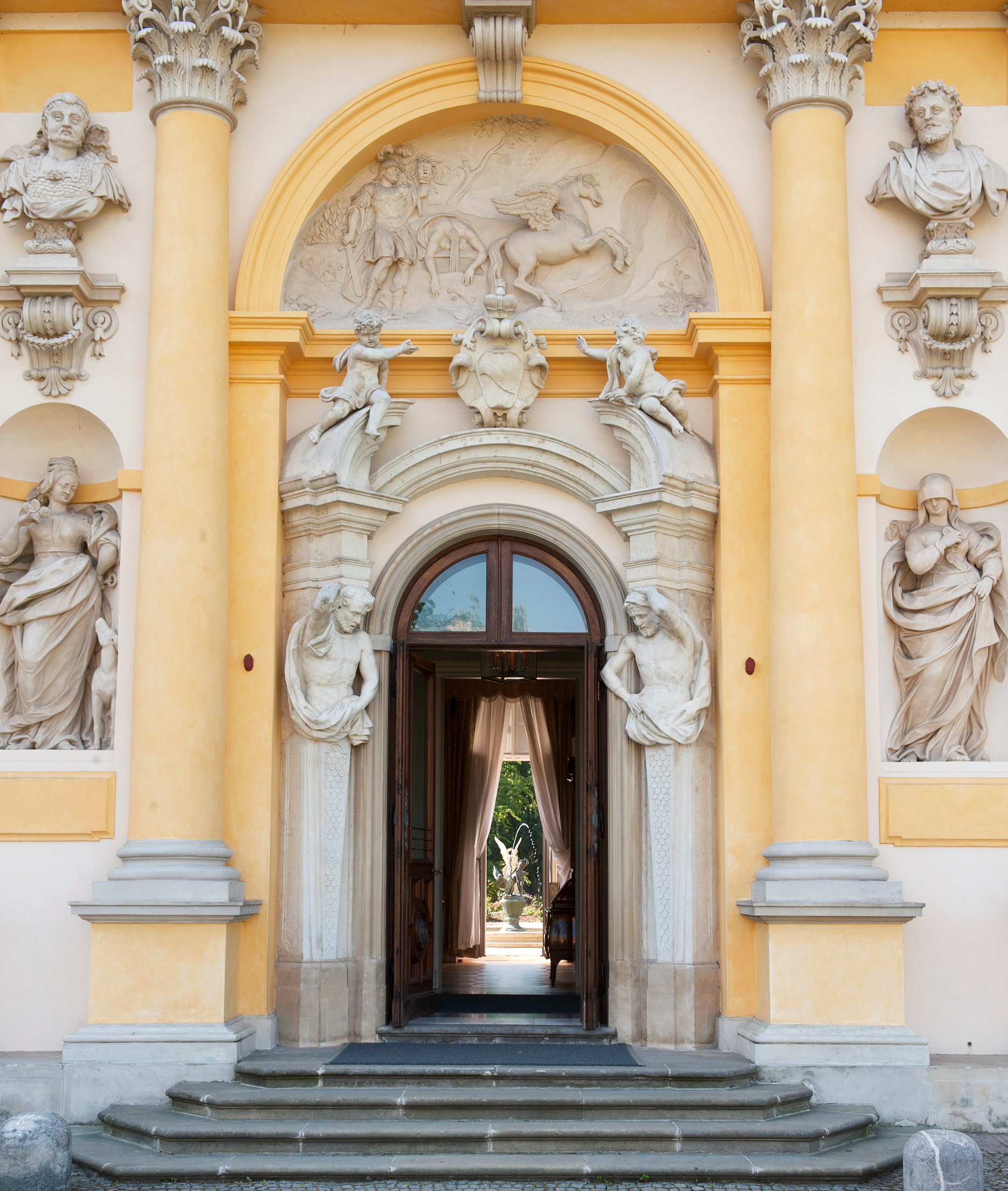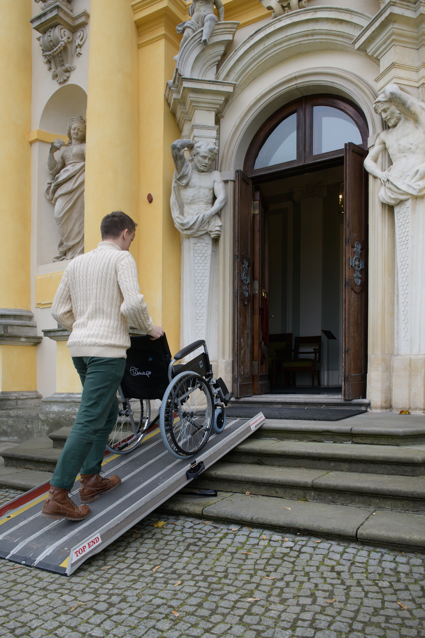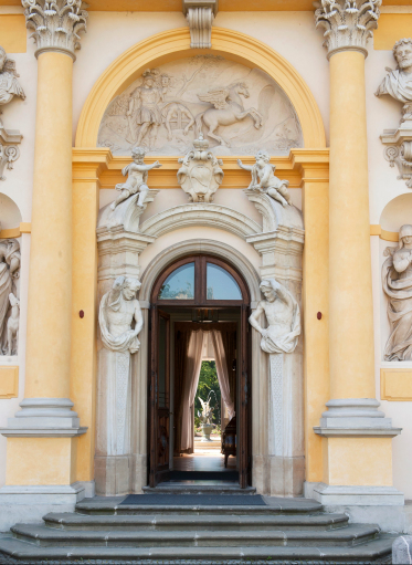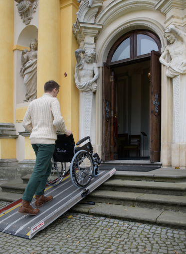 • Steps with a total height of 36 cm lead to the visitor entrance. Additionally, at the entrance there is a 6 cm high threshold. The Museum has foldable ramps to facilitate entry and exit from the Orangery.
