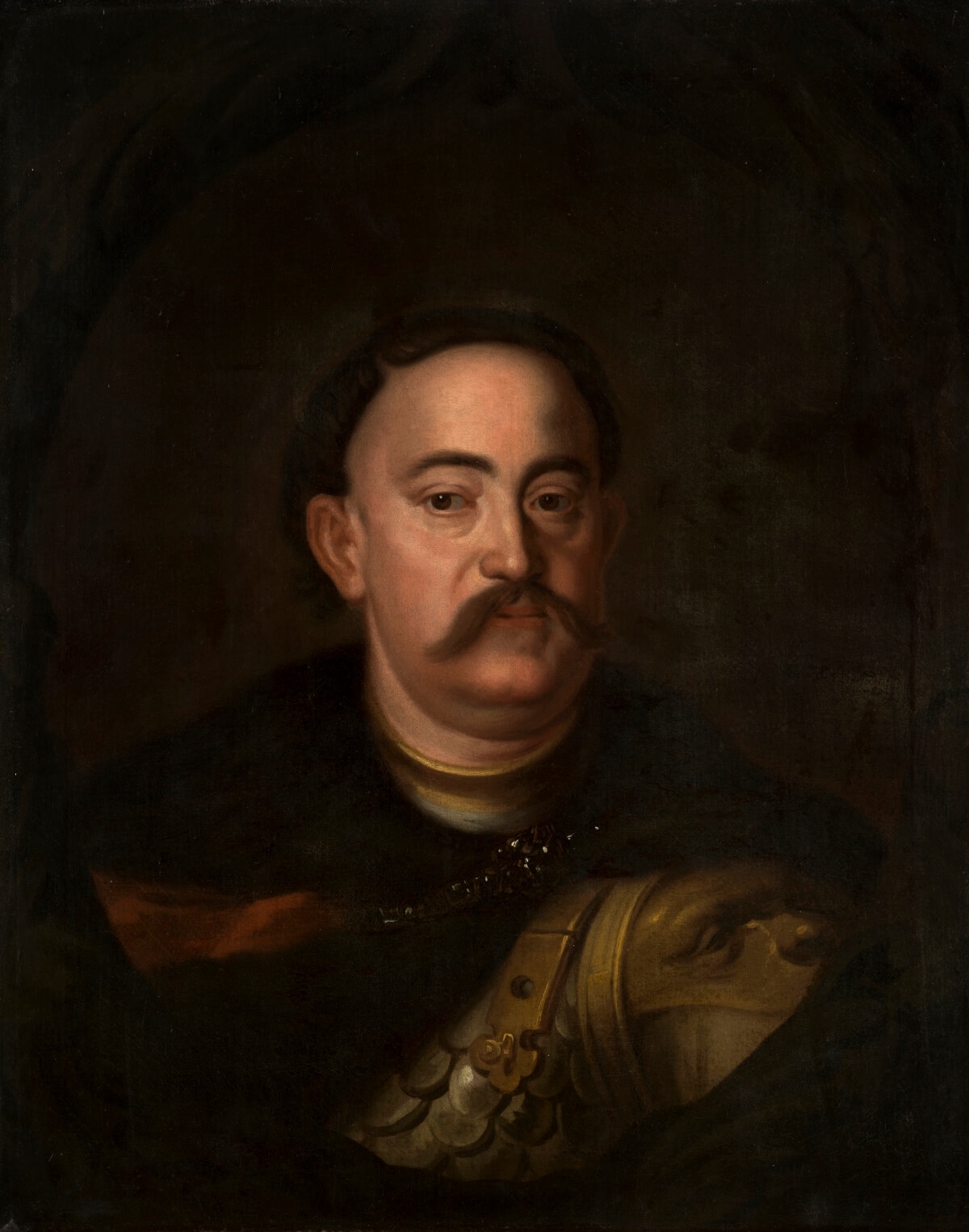 The attribution of the portrait has changed several times. It was described as a work of Jerzy Szymonowicz-Siemiginowski and Jan Tricius – court painters of Jan III. Today, it is definitively identified as the work of an unrecognised artist connected with the court of Jan III. Andrzej Ryszkiewicz[4], a scholar who dedicated a broad study to the group portraits in Polish art history, linked this work of art to an entry from the 1726 inventory of the Zhovkva castle. The description states: Obraz wielki, bez ram, na płótnie, ekspresja całej familii ś. p. króla jegomości (z Oławy), oryginał (A large picture, without frames, on canvas, expression of the whole family of the late king (from Oława), original)[5]. The author of the hypothesis suggests that the Wilanów portrait is a reduced copy of this very composition. The term 'original', which appears next to the inventory entry, may be a clue here, as it may indicate that – perhaps – already during the king's lifetime – repetition (or repetitions) of this scene were made. We come across traces of the practice of copying paintings from the Sobieski collection in inventory lists and other sources, but the clearest evidence remains of paintings that have repetitions, such as numerous portraits of the king himself. Mariusz Karpowicz found Ryszkiewicz's hypothesis plausible and, based on it, suggested that the author of the original could rather have been recalled above Jerzy Szymonowicz-Siemiginowski[6], a painter associated with Sobieski's court and a royal scholarship holder at Saint Luke's Academy in Rome. Despite the artistic shortcomings of the portrait, which are manifested, for example, in the schematic rendering of the physiognomic features of the portrayed, the presentation is an extremely valuable iconographic document in the stock of portraits of the Sobieski family. The strength of the work lies in its composition – the skilful arrangement of the plans and the figures depicted on them in a hierarchical manner[7], the complex symbolic message and the coherent connection of the portrait part with the architectural background. This indicates a very skilled painter of the original who, most probably, had other representative images of members of the royal family in his oeuvre and was familiar with the codified language of such iconography. Szymonowicz-Siemiginowski may be indicated by the presence of certain features or components that we find on other works attributed to him or associated with his workshop. These include, for example, the similarities in the positioning of the figure of Prince Jakub in the family portrait in question with the image that shows him in the company of the king-father[8], as well as the similar, combined outfit of Jan III in the engraved equestrian image according to Siemiginowski's drawing, transferred onto the plate by Charles de la Haye circa 1690[9]. Analogies with the works of the court painter of King Jan III can also be found in the king's physiognomic features or attributes that appear in the composition.