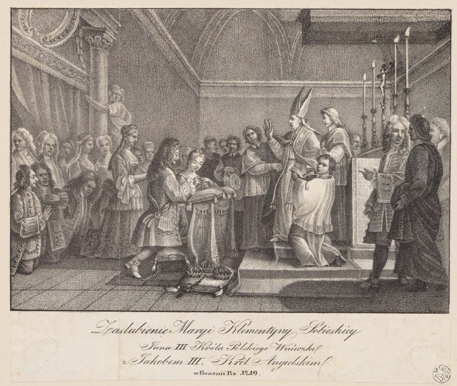 The lithograph depicting the wedding of Clementina and James illustrated an article by historian and linguist Jerzy Samuel Bandtkie (1768–1835), entitled “Marya Klementyna Sobieska, fourth daughter of Prince Jakub Sobieski…,” published in the periodical Pamiętnik Krakowski Nauk i Sztuk Pięknych (vol. I, no. 2, Kraków 1830). Inside the chapel, in front of the altar, the bishop of Montefiascone blesses the kneeling couple as James puts a ring on Clementina’s finger. In this scene, reminiscent of a theatrical performance delivered in candlelight, they are accompanied by a handful of courtiers.