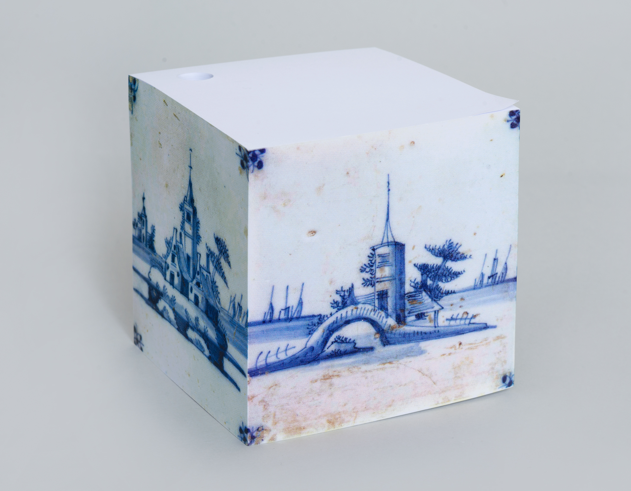 A cube-shaped notebook with a side print showing a decoration from the Faience Cabinet, circa 1690.