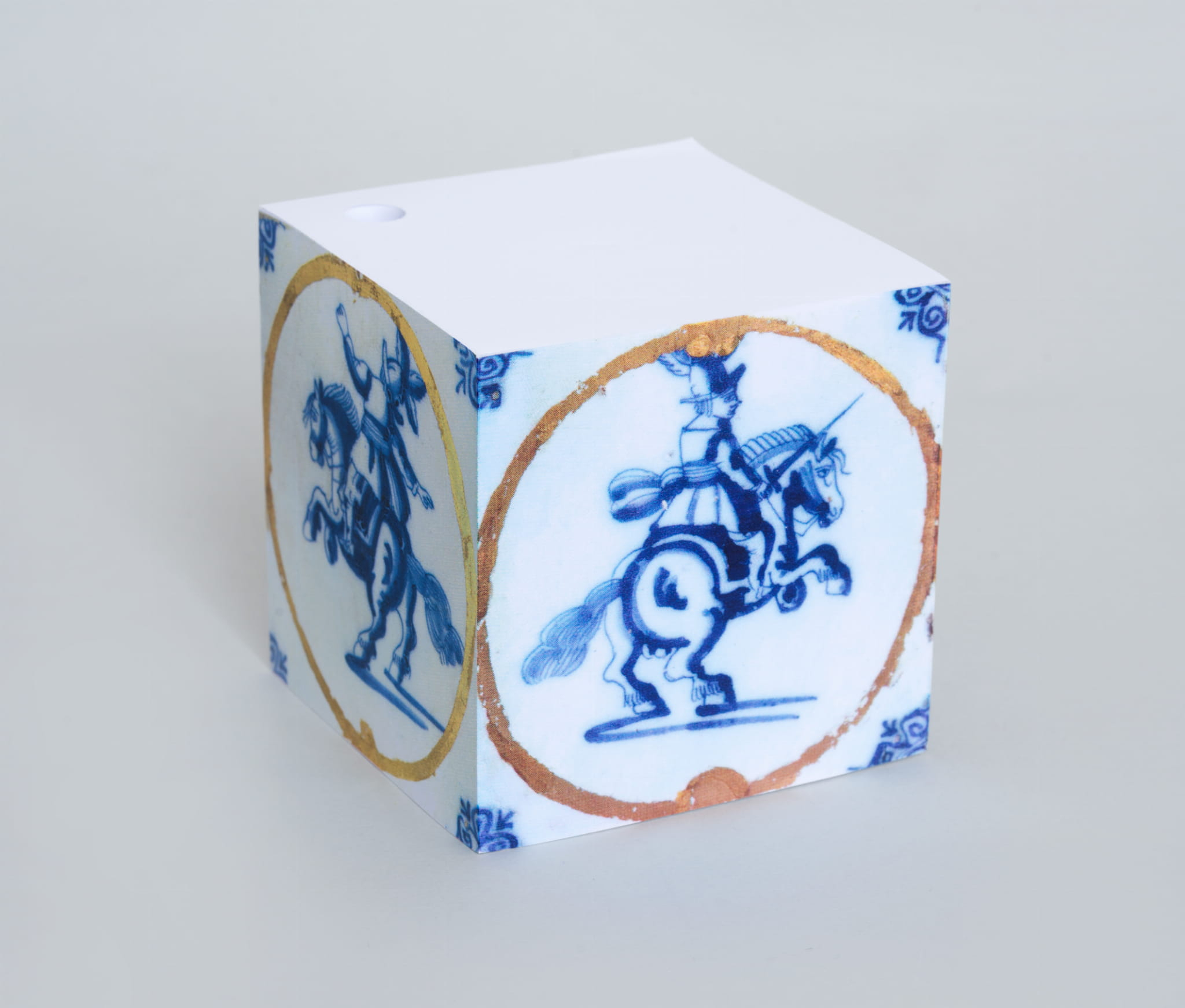 A cube-shaped notebook with a side print showing a decoration from the Faience Cabinet, circa 1690.