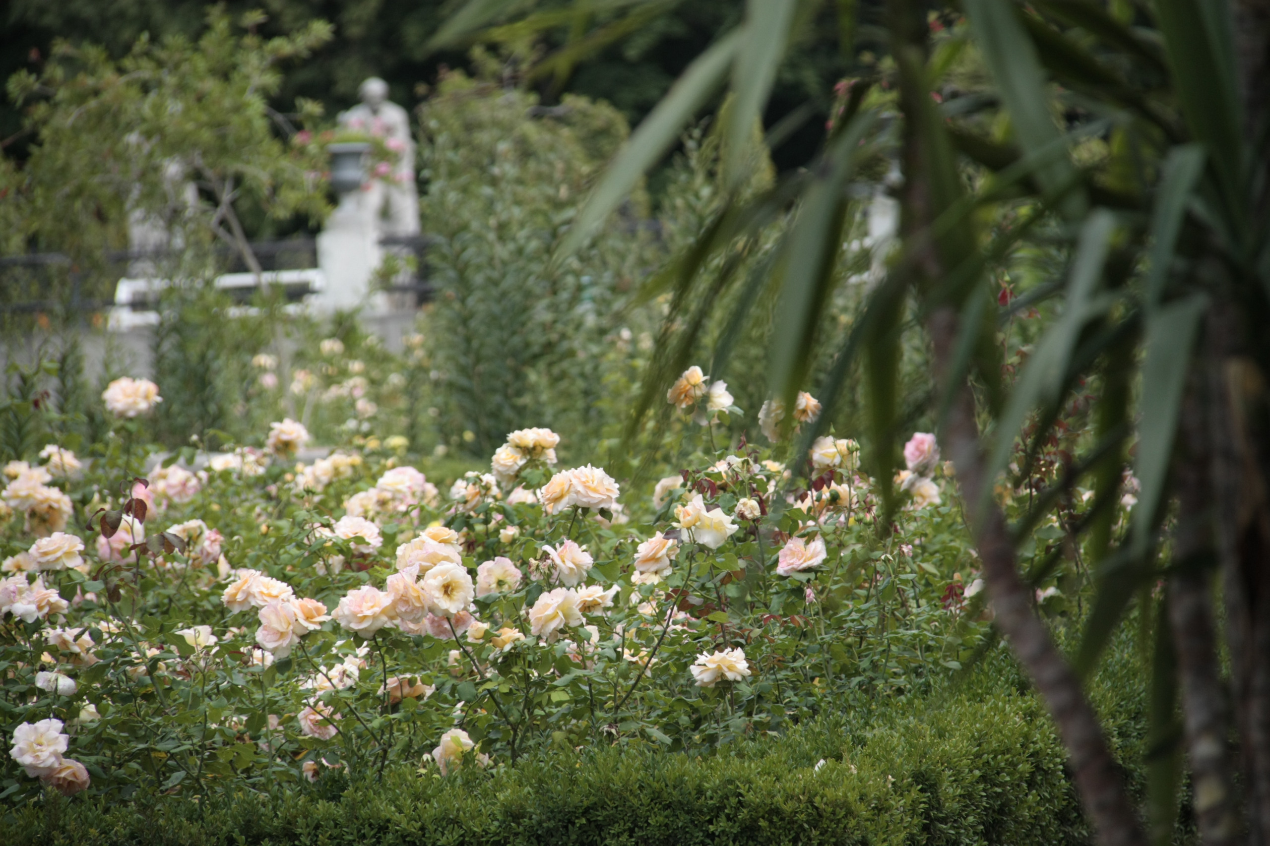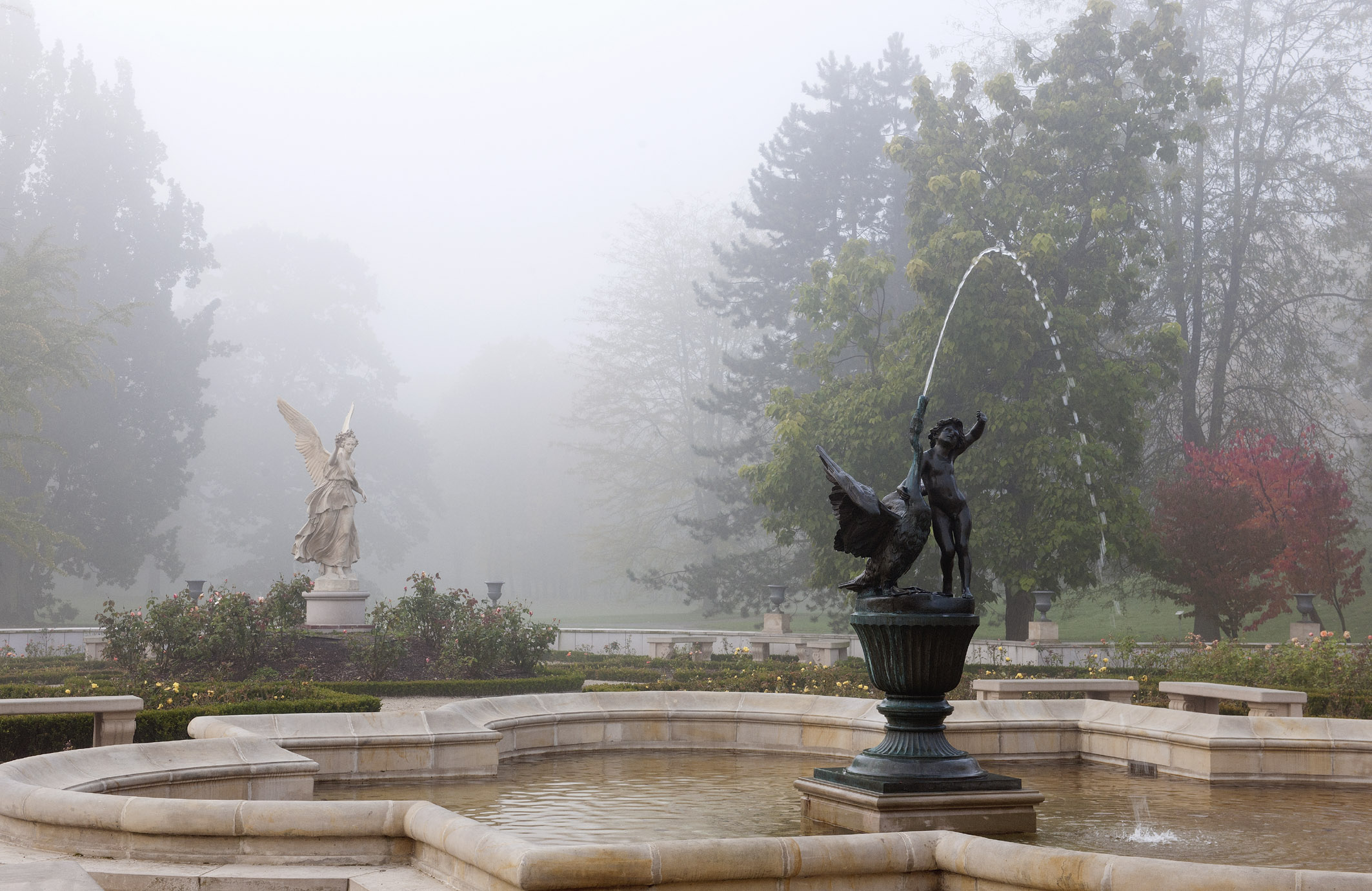 An intimate garden filled with historic varieties of English and French roses, in warm pastel shades. The sculptured decor comprises a ceramic statue of Victory and four allegorical sculptures, Harmony, Beekeeping, Farming and Fishing, crowning the pillars of the gate to the South Landscape Park as well as a centrally located fountain topped with a figure of a boy with a swan.