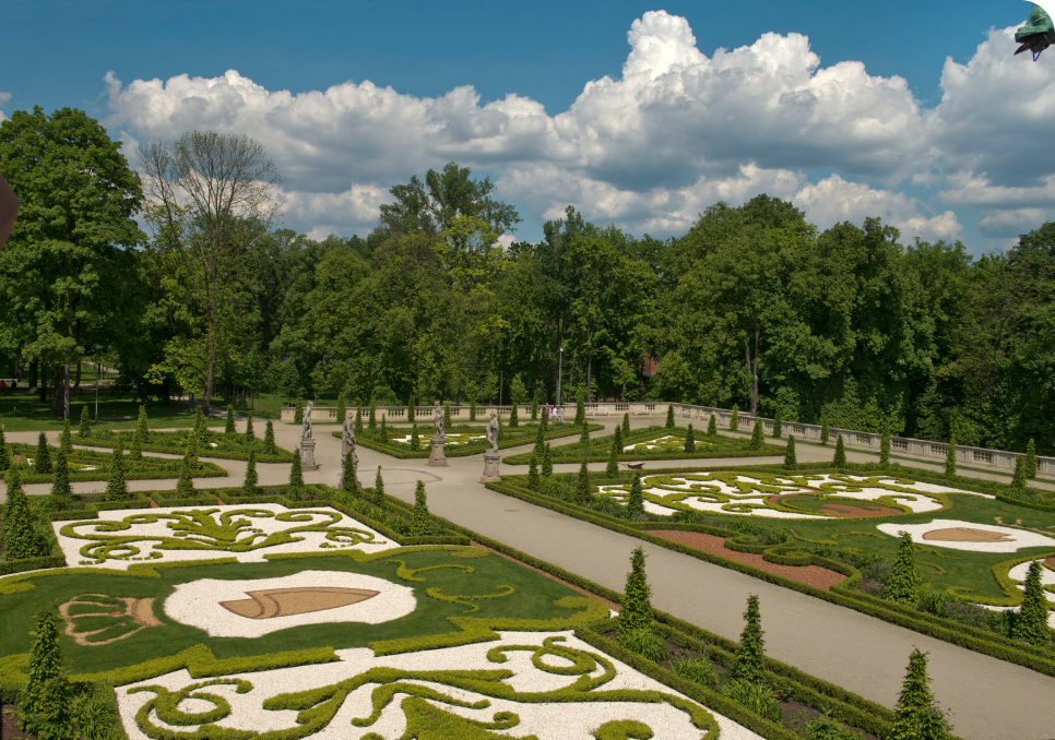 A picturesque English-Chinese garden from the end of the 18th century takes advantage of the varied terrain. Freely wandering paths and plantings of trees and shrubs were meant to give the impression of an idealised imitation of nature. Several decades later, this garden was enlarged and transformed by Stanisław Kostka Potocki into a landscape park, which can be admired to this day.