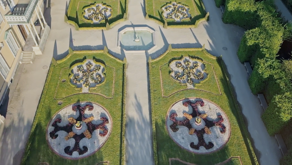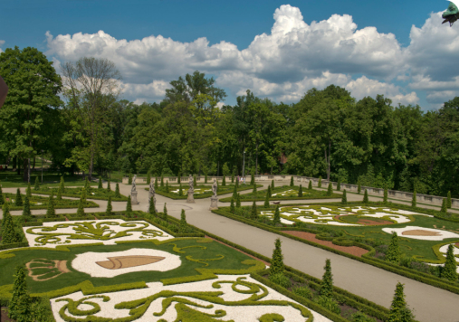 This part of the garden consists of sixteen quarters surrounded by hedges of beech and decorated with flower borders, hornbeam trimmed into conical shapes, and ornamental features of beech and coloured chipped rock. Among the plants grown here, visitors can find species typical of the Baroque era: peonies, pasque flowers, daffodils, tulips, bellflowers, asters, lilies, and larkspur. In summer, the Baroque composition is complemented by flowering and fruiting citrus trees and exotic plants in white-green pots.