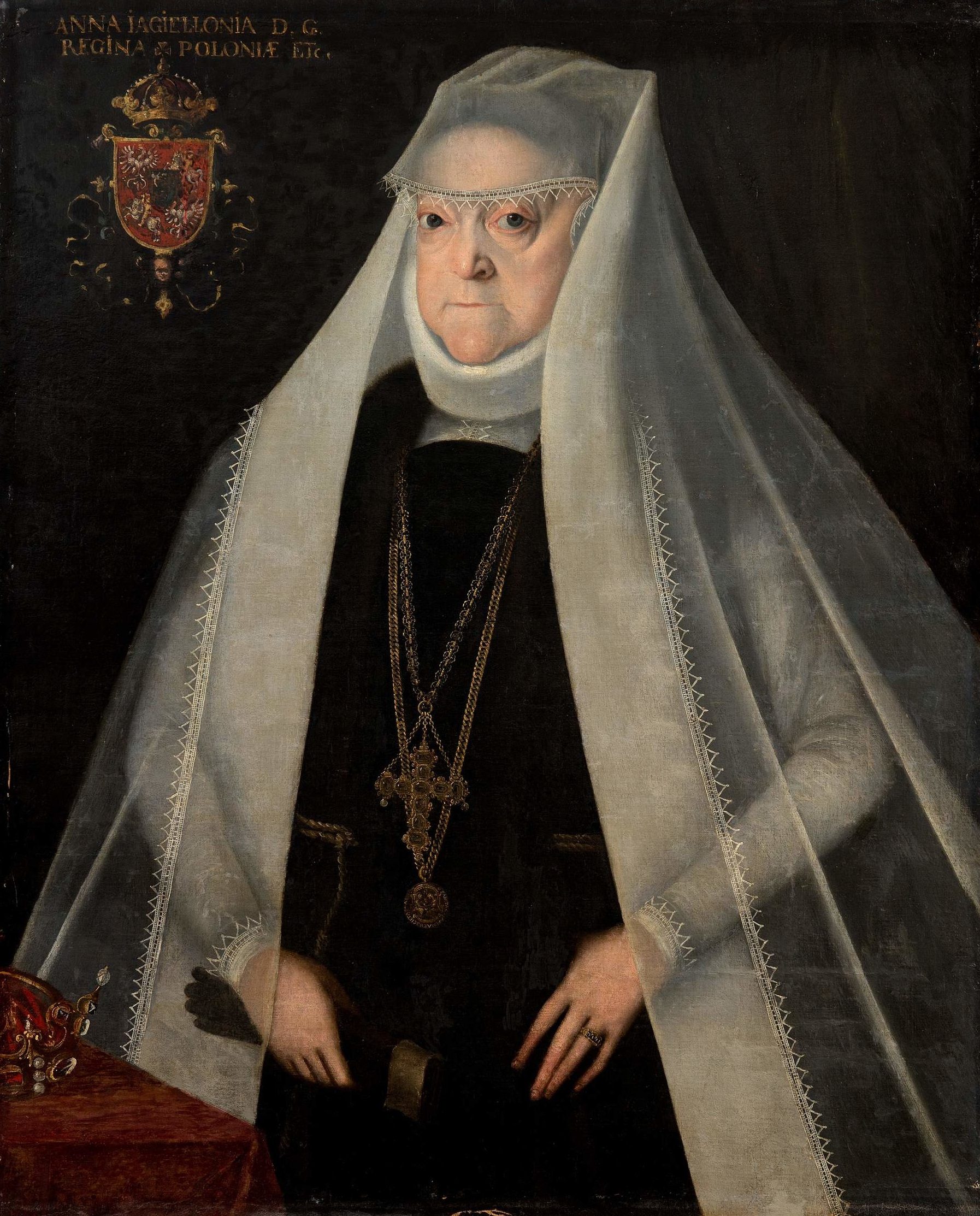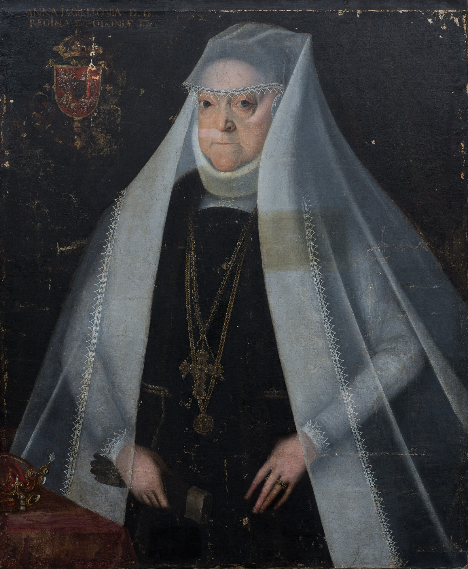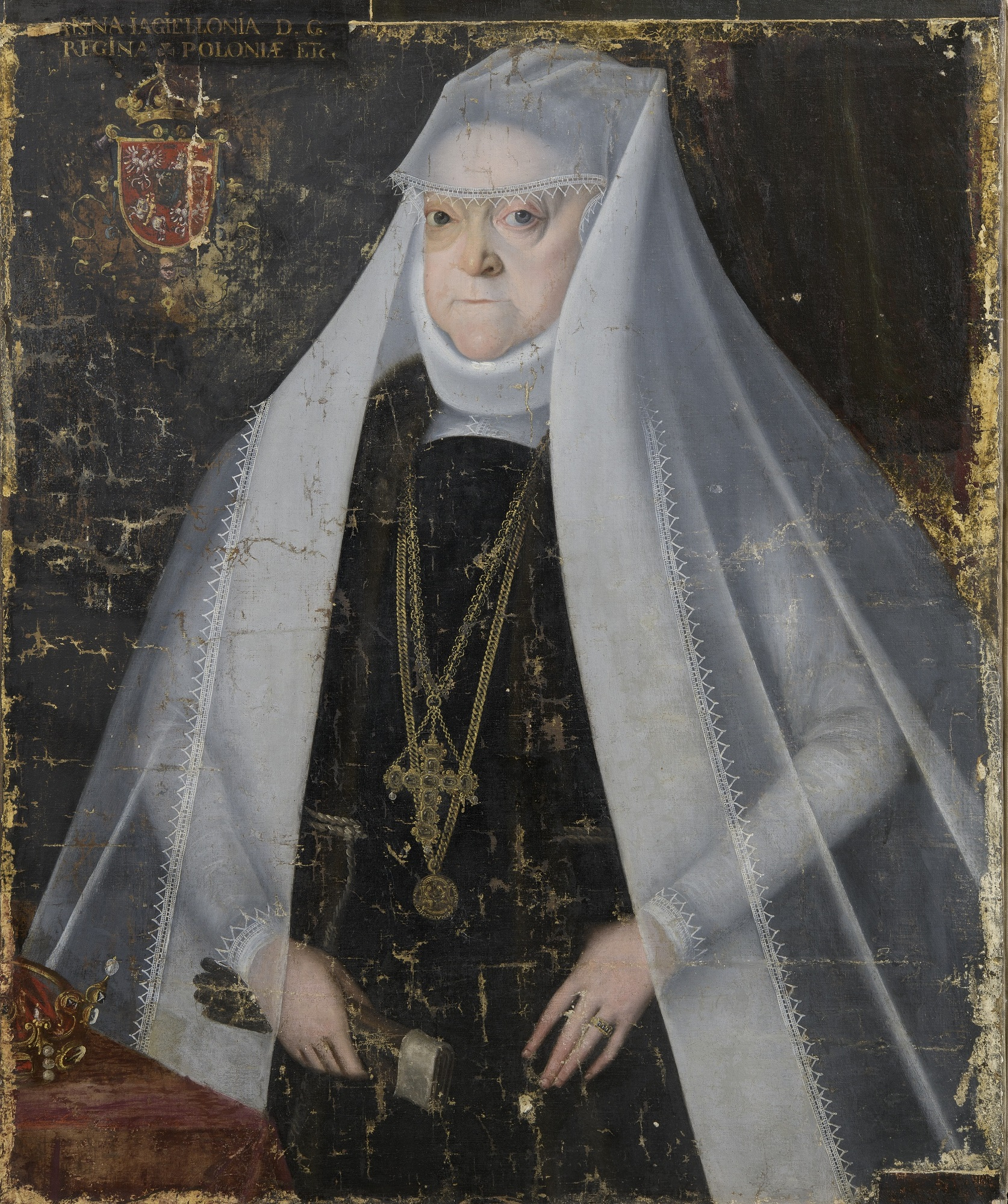 Zdecydowano się pozostawić wtórnie namalowaną inskrypcję. Szczegółowe badania MAXRF wykazały, że dolna część napisu na oryginalnym płótnie zawiera pigment cynowo-ołowiowy, identyczny z użytym w innych żółtych elementach obrazu, takich jak biżuteria, korona i kartusz herbowy. Oznacza to, że inskrypcja istniała pierwotnie, a jej pozostałości były na tyle widoczne, że pierwszy konserwator mógł ją wiernie odtworzyć.