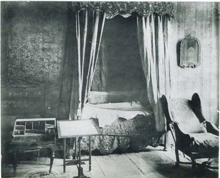 Fotografia archiwalna z przedstawieniem wnętrza pałacu z łożem paradnym z baldachimem w centrum.