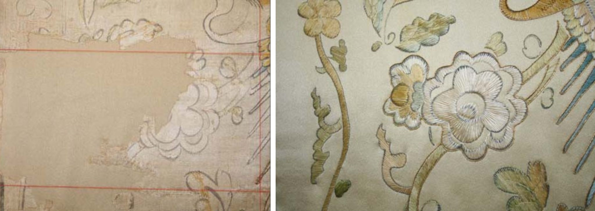 Fragment oryginalnego uszkodzonego ornamentu (po lewej) i zrekonstruowany fragment haftu na kopii (po prawej)