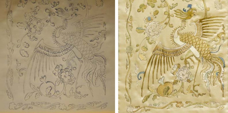 Bordiura kopii: rysunek tuszem na jedwabiu i ten sam fragment po skończeniu prac.