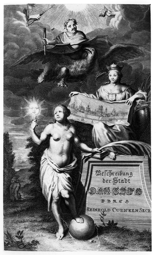 Nic zatem dziwnego, iż w – wydanym jeszcze za życia polskiego króla – dziele Reinholda Curickego Der Stadt Dantzig historische Beschreibung (Amsterdam und Dantzig 1688) nie mogło zabraknąć wizerunku wyjątkowo życzliwego miastu Sobieskiego. Przed drukowaną kartą tytułową dzieła znalazła się niesygnowana rycina (miedzioryt z akwafortą) o wysokim poziomie artystycznym, stanowiąca de facto drugą taką kartę – w całości sztychowaną. W strefie ziemskiej przedstawia ona dwie kobiece alegorie: stojącą Veritas (Prawdę) ze słońcem i palmą w rękach oraz siedzącą personifikację Gdańska, trzymającą zwój papieru z panoramą miasta. Nad nimi szybuje na orle, niczym boski Jowisz, Jan III – w wieńcu laurowym, antykizujących sandałach i w płaszczu, z regimentem i tarczą z monogramem I3. Orzeł, „ptak niebieski” i atrybut Jowisza, uchodził za króla ptaków i ptaka królów. Apoteoza Sobieskiego wyraźnie więc nawiązuje do apoteozy rzymskich cesarzy, unoszących się do nieba właśnie na orle. Nad głową bohatera skłębione obłoki rozstępują się, odsłaniając światłość; z niej wyłaniają się dwie dłonie dzierżące berło i otwartą koronę.
