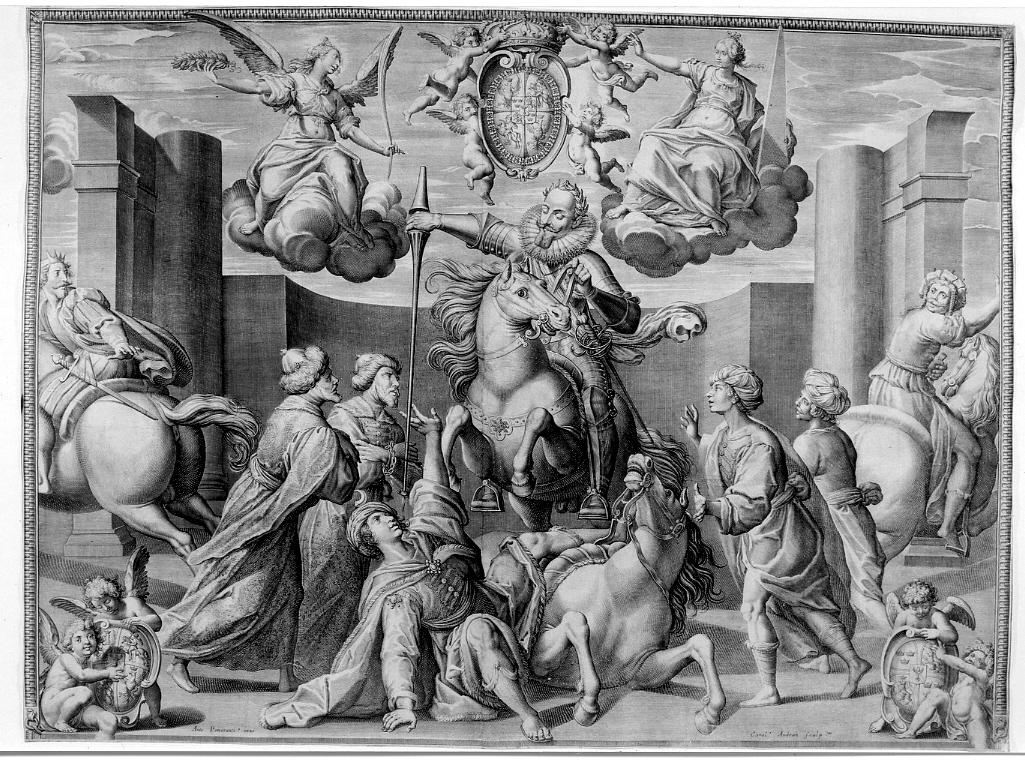 Dla uczczenia zwycięstwa Zygmunta III nad Turkami (mowa o wiktorii chocimskiej 1621 r.) w Rzymie około roku 1629 powstał nadzwyczaj okazały wymiarami miedzioryt (60 x 80, 8 cm), bez żadnych napisów objaśniających, sygnowany w obrębie kompozycji przez francuskiego rytownika Charlesa Audrana zwanego Karl (1594 – 1674) i włoskiego malarza historycznego Antonia Circignani zwanego Pomarancio (ok. 1569/ 1572 – 1629). Ta obfitująca w osiemnaście postaci, a więc dość stłoczona, kompozycja należy do wyjątkowych rzadkości. Wyobraża polskiego władcę w pełnej zbroi i w wieńcu laurowym, siedzącego na wspiętym koniu i uderzającego kopią w strąconego z wierzchowca Turka. Z dwóch stron do triumfującego Zygmunta podbiegają dwaj bojarzy w kajdanach (najprawdopodobniej carowie Szujscy) i dwaj Turcy – wszyscy błagający o zmiłowanie. W głębi oddalają się w panicznej ucieczce dwaj jeźdźcy. Oprócz dwóch grup puttów, rozmieszczonych symetrycznie w dolnych rogach kompozycji, wysoko na obłokach, nad parawanową architekturą unoszą się Sława i Chwała, wskazując na grupę czterech innych puttów dźwigających kartusz z dziewięciopolową tarczą herbową ze Snopkiem w polu sercowym. Sztych sporządzono na dwóch osobnych miedzianych matrycach, a odbitki sklejono następnie w jedną całość.