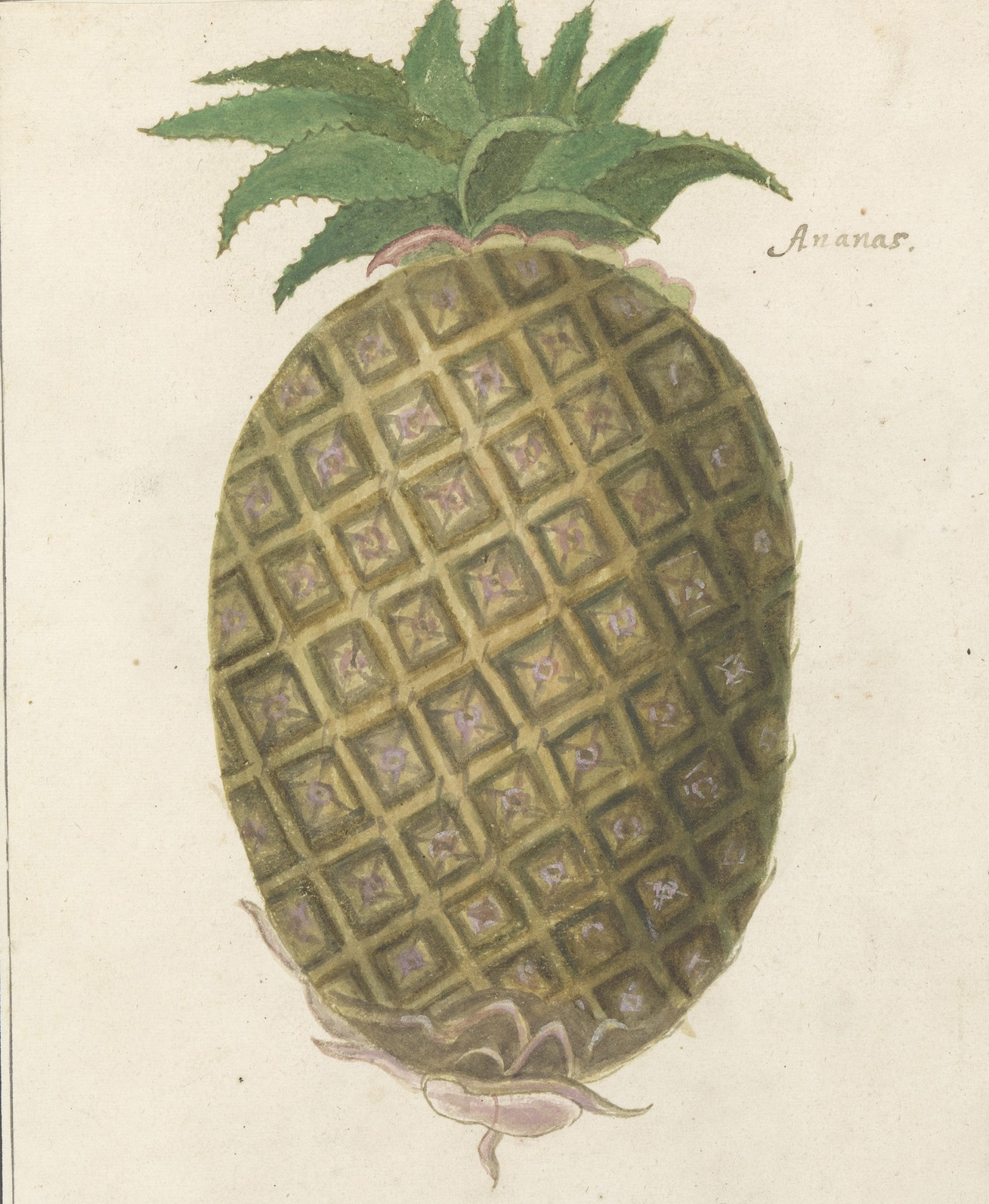 „Niedawno ukazał się mym oczom król owoców, szlachetny ananas; był naprawdę wspaniały i cieszył wzrok, gdy przyniesiono go nam z naszego ogrodu; patrzyłam nań z przyjemnością i myślałam: wyborna roślino, jesteś godna, aby przyglądać się tobie z uwagą i w skupieniu ku chwale twego Stwórcy” – pisała Anna Renata. – „Ten zadziwiający owoc przywieziono przed pięćdziesięcioma laty z Ameryki do Azji i Afryki, wreszcie zaś do Europy, razem z innymi rarytasami i osobliwościami [botanicznymi]. Tam [w swej ojczyźnie] wyrastałby z ziemi całkiem dziki, ale tu [w Gdańsku] trzeba go pilnie doglądać i kultywować. Ten piękny owoc przynosi największą rozkosz nie tylko oczom, leczy również ustom i nosowi; oko [kontempluje] w [bezkresnym] zachwycie niezwykły przepych i majestatyczny kształt pięknego ananasa; owoc sam w sobie jest podłużny i okrągławy, z zewnątrz widać wiele kosteczek; [ich] rzędy stoją w najpiękniejszej symetrii [ciasno] i zgrabnie jeden przy drugim. Dobry Stwórca wszelkiego stworzenia przyozdobił [jagodę] głęboką złotożółtą barwą; zwłaszcza wtedy, gdy figlarne światło słoneczne przebija się przez gęsty cień, można zobaczyć jak [owoc] błyszczy złotym blaskiem, dzięki czemu wzrusza zarówno oczy, jak i serce […] Ba!, nie można go także łatwo zranić, gdyż dzięki dobrej Naturze jest gęsto pokryty długimi i silnymi liśćmi, które z wierzchu są białawe, wewnątrz zaś ciemnozielone i elegancko prążkowane niczym Gros de Tour [czyli francuska tkanina grogram], na końcach zaś ostre i spiczaste. Dzięki nim – swym drabantom – [roślina] chroni zbrojnie i mężnie [zrodzony] owoc niczym królową. Korona, która przyozdabia tę roślinę, ma także zdumiewający i cudowny kształt. Z pięciu, sześciu, a nawet siedmiu poziomów wyrastają nad sobą i na boki niewielkie równokształtne liście. Korona [zgrabnie] rośnie i może bez trudu zrodzić nowy byt. Łodyga znajduje się w samym środku, idzie od owocu do korony [ tj. rozety], jest żółto-zielona i jakby oprószona najdelikatniejszym pyłkiem. Wyborny zapach wypełniający i balsamujący powietrzne jest przyjemny, ba, wręcz oczarowujący; zwłaszcza wtedy, gdy kroimy owoc, urocza słodka woń ożywia mózg i ducha. Dzięki unikalnemu smakowi [ananasa] nasz język doświadcza rzadkiej przyjemności; jest to cudowne przemieszanie brzoskwiń, moreli, pigw i wielu innych fruktów; [ananasowy] kwaśno-słodki [smak] przyjemnie orzeźwia naszą pierś, napawa radością, rozkoszą i zachwytem”.