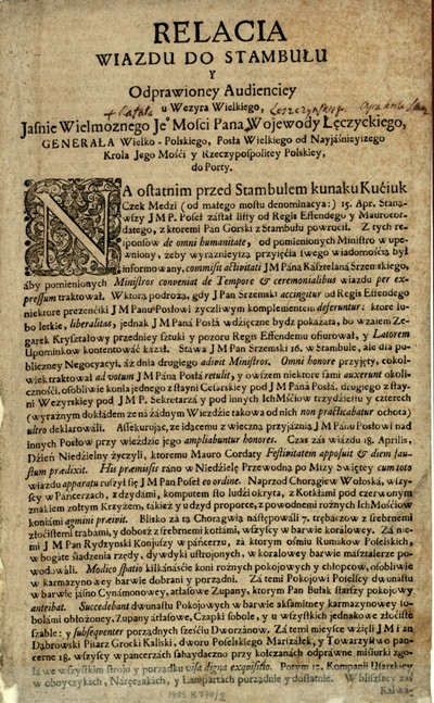 Wspomina poseł Rafał Leszczyński: Nazajutrz tedy, die 28 Aprilis [dnia 28 kwietnia], przyszło na tę miłą audiencyją jachać nie z wielkim ukontentowaniem moim. Przyjachał czausz po południu z Turkami, pięknego konia przyprowadzono pode mnie płowego i sześćdziesiąt pod inszych. Ruszyłem tedy tym porządkiem: towarzystwo, przyjaciele, biegunowie przed samym koniem. Za mną wkoło konia dwunastu pokojowych w cynamonowej barwie, pieszo sześciu pachołków w srebro ubranych. Po stronach kurucowie. Za koniem dwunastu aksamitnych na koniach pokojowych. Za nimi wołoskie towarzystwo i rajtaryja pieszo assystencyje tureckie z temi ceremonialnemi zawojami praecedebant [poprzedzali] i takem wprowadzony. Maurocordaty czy studio [umyślnie] czy casu [przypadkiem] na podagrę zachorował. Z tym nieukontentowaniem o kaftan jadąc, visum [zdało się] mi przed wezyrem to nadmienić, aby przynajmniej widzieli, że się w tym serio baczę. Na schodach zastałem syna Maurocordatego bardziej do Żydka niż do czego podobnego kompleksyją, który mię wprowadził. Zastałem na dywanie janczar agę, kichaję wezyrskiego, reiseffendego i innych Turków z zawojami tymi jako mię czausz basza prowadził, zastałem już dla siebie stołek, ale nie dla wezyra, na którym usiadszy przyszedł syn Maurocordatego, że zaraz wezyr przyjdzie [… tu opis mowy zarówno posła z kolejną przymówką o kaftan, jak i odpowiedzi wezyra…].