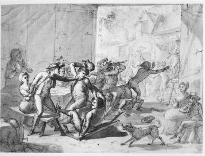 Niewiele zmieniło się pod tym względem i w czasach napoleońskich na polskich ziemiach. Powstały w latach 1810 – 1812 rysunek piórkiem i lawowany sepią Aleksandra Orłowskiego (1777 – 1832) przedstawia taką właśnie bójkę przy kartach, toczącą się w zajeździe. Przy zastawionym stole we wnętrzu siedzi damsko–męskie towarzystwo, a na podłodze leżą rozrzucone karty. Trzej gracze ostro biorą się do bitki, a w głębi walka wręcz trwa już na dobre, czemu przyglądają się strwożone uczestniczki biesiady oraz stara karczmarka. Rysunek powstał w wyraźnym związku z dziełem NorblinaZebranie chłopskie w karczmie (1780): Orłowski zastosował tu światłocień, wyraziście podkreślając brutalne gesty i prostactwo ukazanych postaci. Omówiony rysunek należy prawdopodobnie do nabytków Stanisława Kostki Potockiego i znajduje się wciąż w kolekcji wilanowskiej.
