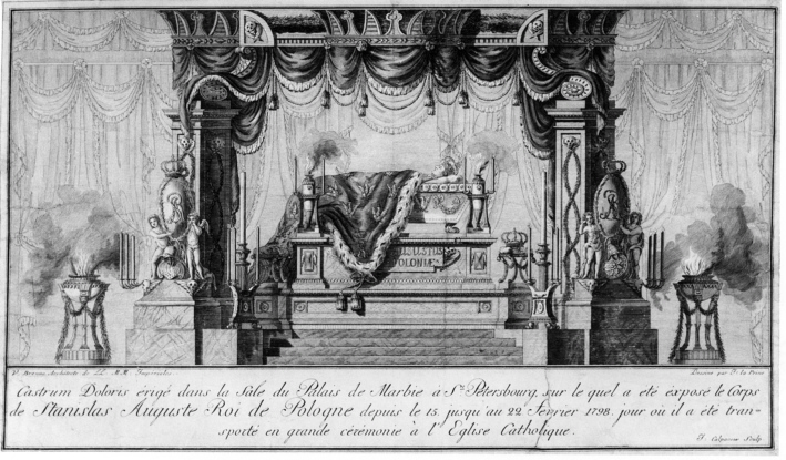 Car Paweł I pochował Stanisława Augusta z honorami należnymi monarsze. Ciało królewskie zabalsamowano i ubrano w mundur polskiej gwardii narodowej, a na głowę włożono koronę funeralną, sprawioną przez rosyjskiego imperatora. Dziesięć dni trwało przygotowanie w Pałacu Marmurowym wielkiej sali, w której wzniesiono okazały katafalk. Jego szczegółowy opis (jak również relację z królewskiego pogrzebu w kościele Św. Katarzyny w Petersburgu 8 marca 1798 r.) wydał w 1862 r. w Krakowie Lucjan Siemieński.
