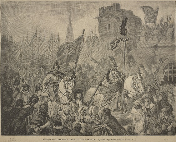 Dzień po zwycięskiej bitwie, 13 września 1683 r., Sobieski udał się ze swojego obozu wraz z elektorem bawarskim Maximilianem II Emanuelem (1662–1726), elektorem saksońskim Janem Jerzym III Wettynem (1641–1691) oraz księciem lotaryńskim Karolem V (1643–1690) pod fortyfikacje Wiednia, by pod przewodnictwem austriackiego komendanta, obrońcy miasta Ernsta Rüdigera von Starhemberga (1638–1701) obejrzeć transzeje, baszty, mur obronny i bastiony. Następnie wraz z najstarszym synem, księciem Jakubem i elektorem bawarskim oraz polskimi magnatami wjechał przez ukryte wypady do miasta. Potęgę zwycięzcy demonstrowała niesiona z przodu, wyszywana złotem chorągiew zaczepiona na dwóch długich drzewcach z pozłacanymi zakończeniami, na których umieszony był turecki buńczuk o długości jednego łokcia. Za wjeżdżającymi prowadzono zdobytego od wezyra konia przykrytego derką wyszywaną złotem, ze złotą uzdą i uprzężą, przy której wisiała szabla turecka wysadzana szlachetnymi kamieniami.