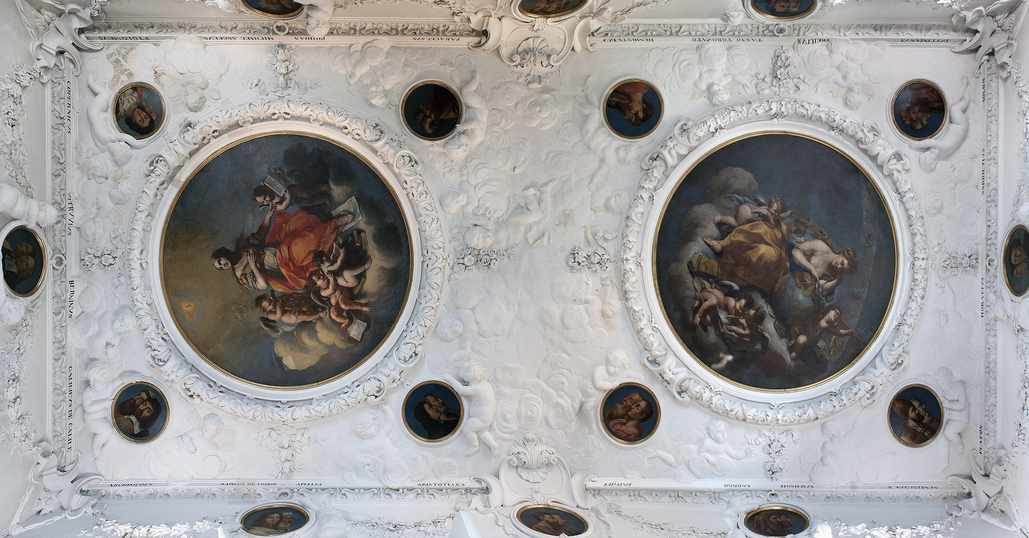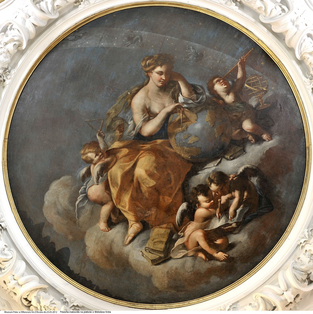 Tondo na suficie w Bibliotece Króla w pałacu w Wilanowie. Przedstawia kobietę w otoczeniu małych amorków. Jest to „Alegoria filozofii”.