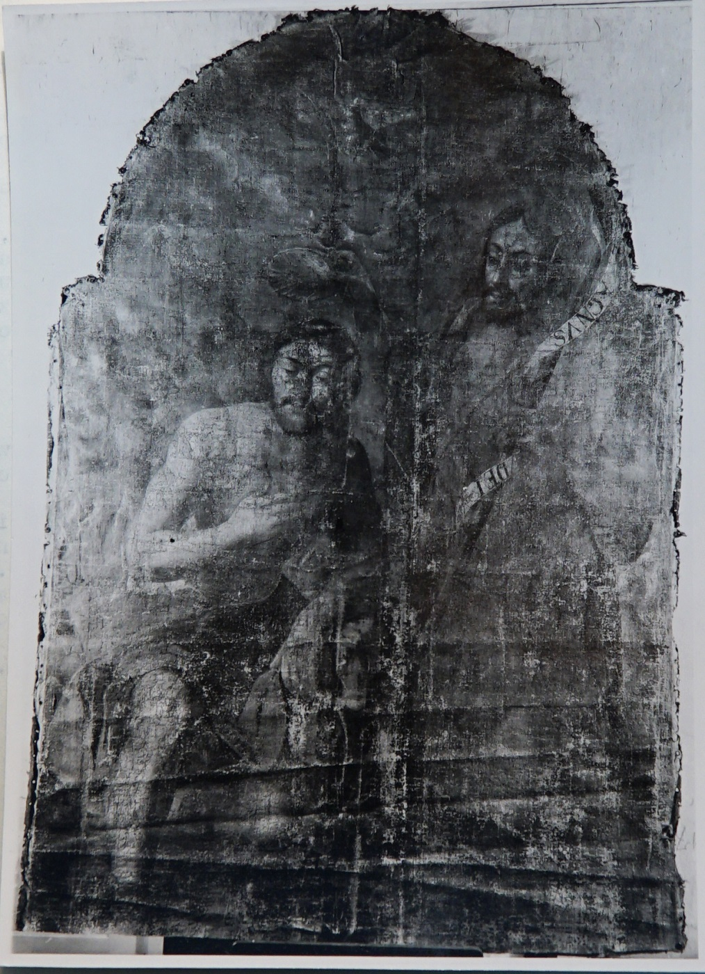 Czarno-białe zdjęcie ukazujące stare płótno a na nim - jak się możemy domyślać – namalowana jest scena chrztu Jezusa w Jordanie. Po prawej stronie stoi Jan Chrzciciel, po lewej stronie klęczy Jezus. Obraz zniszczony, nie widać szczegółów. Jest to „Chrzest Chrystusa” z kościoła w Bychawie.