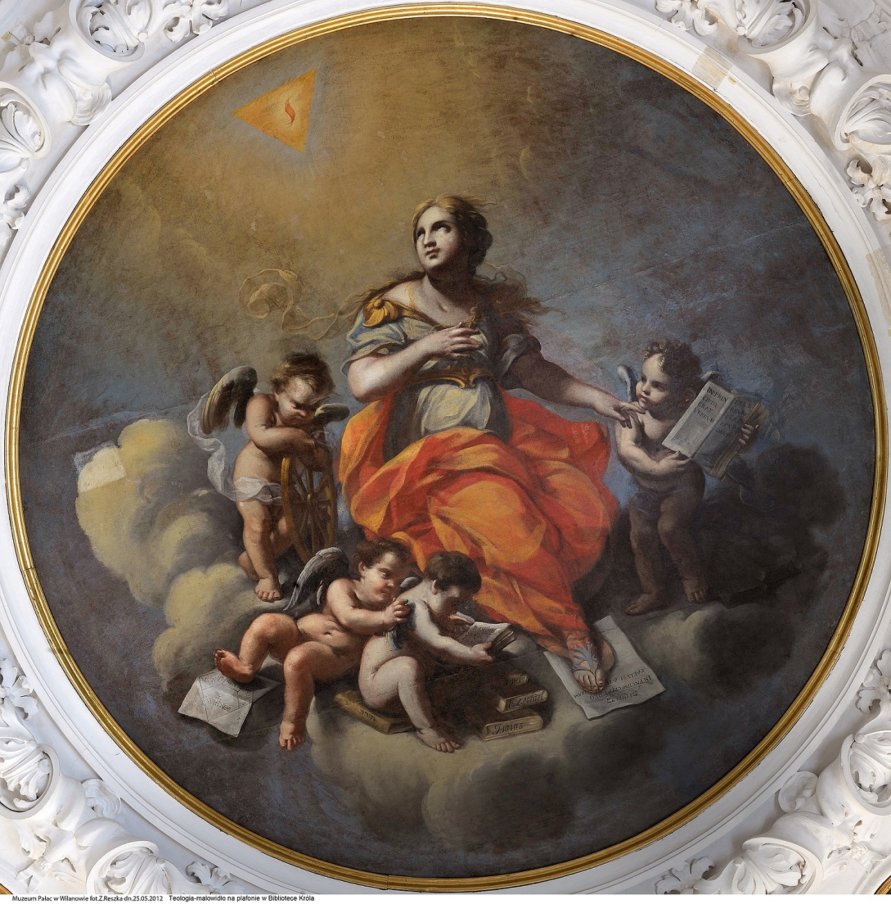 Tondo na suficie w Bibliotece Króla w pałacu w Wilanowie. Przedstawia kobietę w otoczeniu małych amorków. Jest to „Alegoria teologii”.