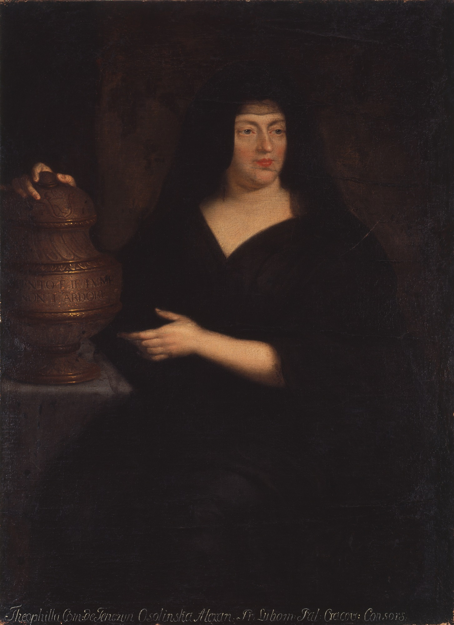 Portret kobiety w średnim wieku, ubranej w czarną suknię i czarny welon na głowie. Kobieta stoi i opiera swoją prawą rękę na miedzianym naczyniu. Lewa ręką wskazuje gestem na naczynie. Kobieta patrzy w przeciwnym kierunku. Portret ukazany na ciemnym tle. Jest to portret Heleny Tekli z Ossolińskich Lubomirskiej.