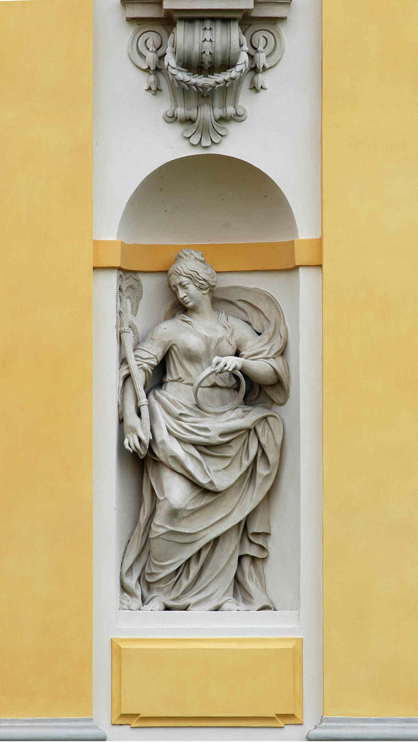 Zdjęcie kolorowe przedstawia niszę a w niej rzeźbę kobiety w antycznej, udrapowanej sukni. Kobieta trzyma w jednej ręce okrąg, a w drugiej gałąź. Jest to przedstawienie alegorii Stałości. Rzeźba znajduje się na elewacji frontowej pałacu w Wilanowie.