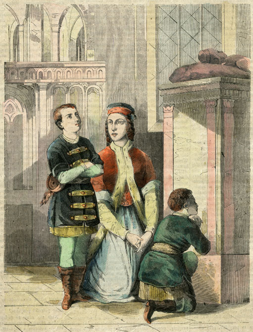 Barwna pocztówka przedstawia kobietę z dwoma chłopcami we wnętrzu kościoła. Jest to matka króla Jana III Sobieskiego z dwoma synami Markiem i Janem, modląca się przy nagrobku hetmana Żółkiewskiego, w kościele w Żółkwi.