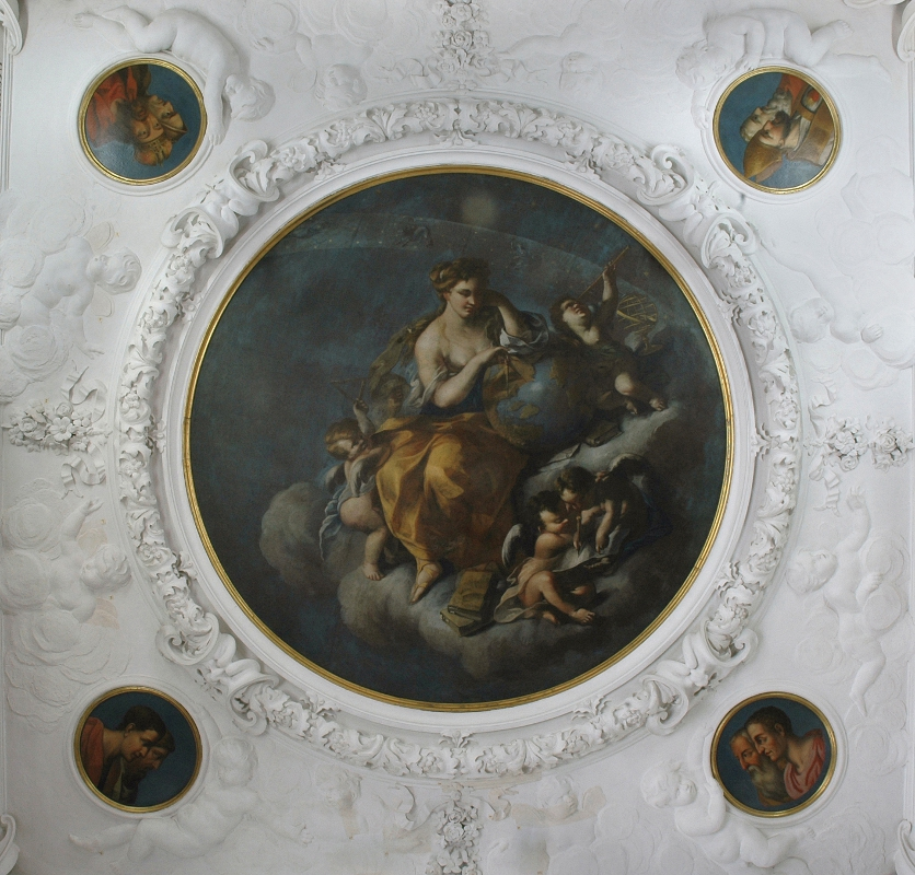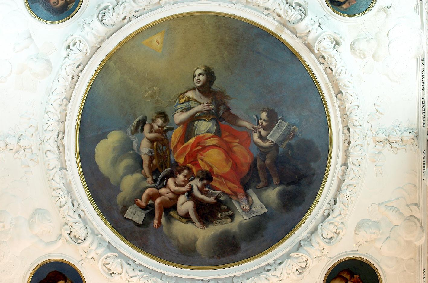 Tondo na suficie w Bibliotece Króla w pałacu w Wilanowie. Przedstawia kobietę w otoczeniu małych amorków. Jest to „Alegoria filozofii”.
