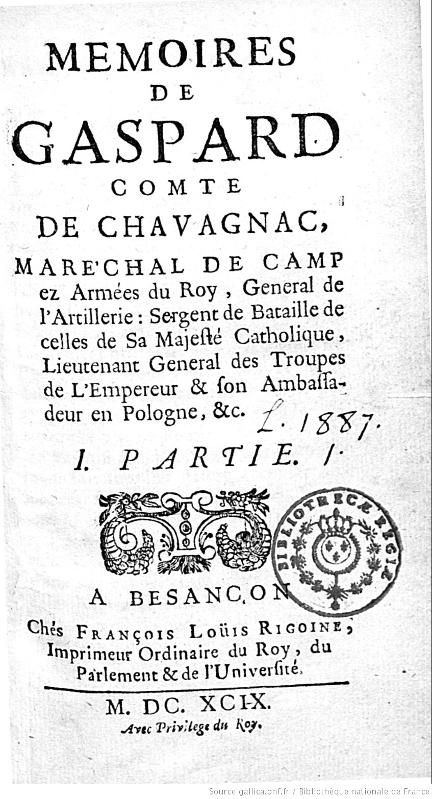 Gaspard de Chavagnac (1624–1695) pochodził z zasłużonej francuskiej rodziny szlacheckiej. Poświęcił się karierze wojskowej i dyplomatycznej. W swoim życiu zdążył zostać zarówno marszałkiem polnym Francji, jak i generałem na służbie austriackich Habsburgów. Podczas Frondy (1648–1653) walczył po stronie Wielkiego Kondeusza przeciw królowi Ludwikowi XIV. Później jednak pogodził się z władcą. Nie zagrzał wszakże miejsca we Francji i w 1665 r. przyjął służbę u króla Hiszpanii Filipa IV. Miał pecha, gdyż ówże zmarł w tym samym roku. Chavagnac przeniósł się więc do Wiednia, gdzie poznał się z Karolem Lotaryńskim i podjął się reprezentowania go na polu elekcyjnym w Polsce. Warto dodać, że później brał udział w kampaniach wojennych pod komendą Lotaryńczyka, by wreszcie w 1681 r. za zgodą Ludwika XIV powrócić do Francji. Pozostawił po sobie pamiętniki (Mémoires), wydane pośmiertnie w Besançon w 1699 r.