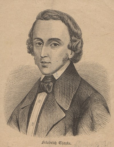Portret młodego mężczyzny z orlim nosem i rozwianymi włosami. Ubrany w białą koszulę oraz garnitur. Przy szyi zawiązana kokarda, poniżej na ubraniu chusta. Jest to Fryderyk Chopin.