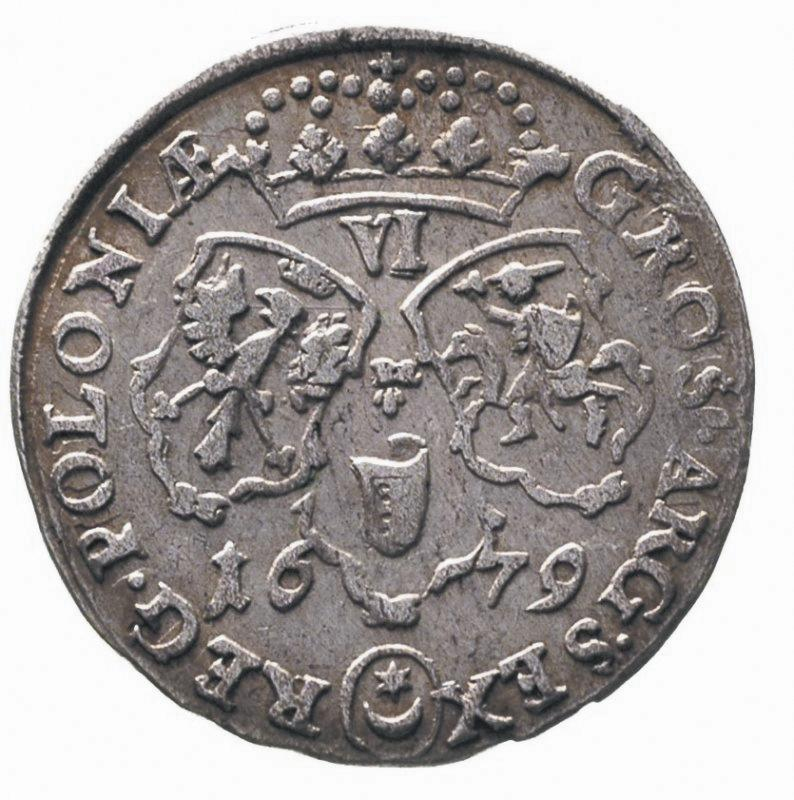 Moneta z przedstawieniem króla Jana III Sobieskiego z profilu. Jest to sześciogroszówka Jana III Sobieskiego.