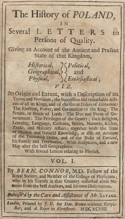 Irlandczyk Bernard O’Connor (ok. 1666 – 1698), fizyk, przyrodnik i historyk, studiował medycynę na uniwersytetach w Montpellier i w Paryżu (doktoryzował się w Reims w 1691 r.). Podczas pobytu w Paryżu poznał dwóch Polaków, prawdopodobnie synów kanclerza k