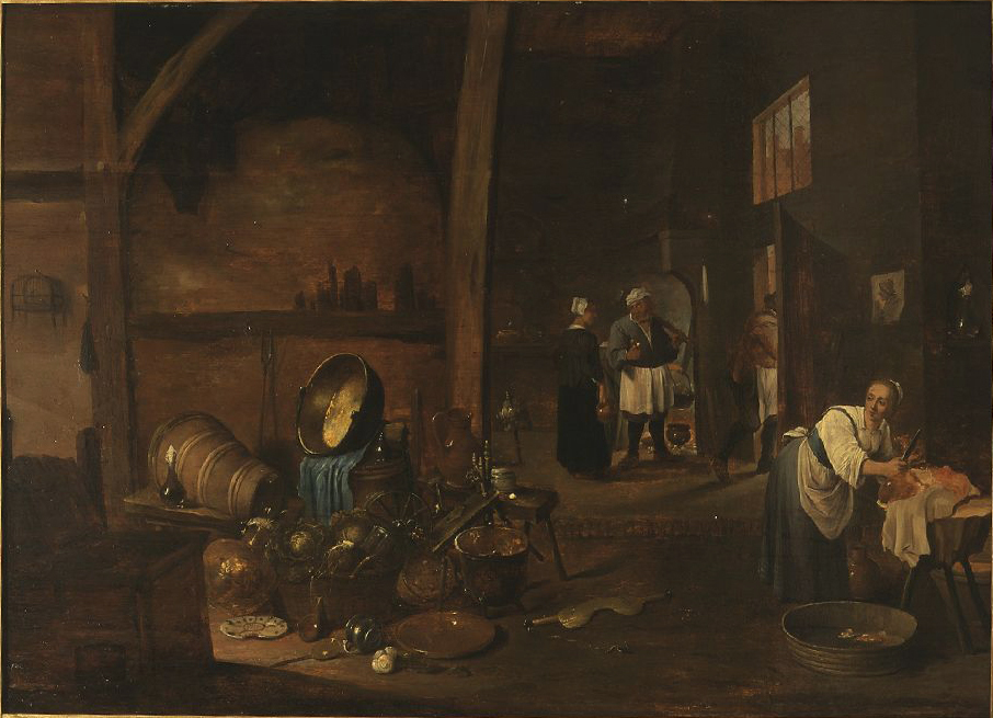 Ilustracja z rysunkiem, który przedstawia wnętrze. Stoją w nim beczki, na półkach leżą dzbany i potrawy. Po prawej stronie schody i wejście. Na środku konstrukcja drewniana, wyglądająca na pułapkę.