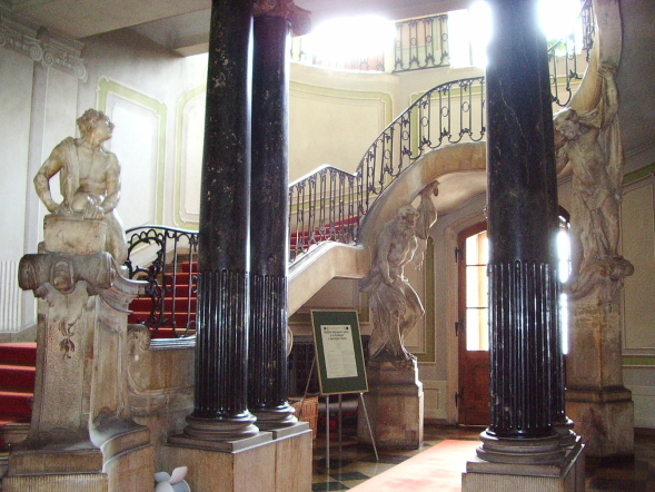 Zdjęcie kolorowe wnętrza pałacowego. Jest to klatka schodowa. Z przodu czarne, kamienne kolumny. Z lewej strony przy wejściu na schody rzeźba na postumencie. Również przy drzwiach wejściowych dwie rzeźby męskie. Jest to klatka schodowa w pałacu Jana Klemensa Branickiego w Białymstoku.