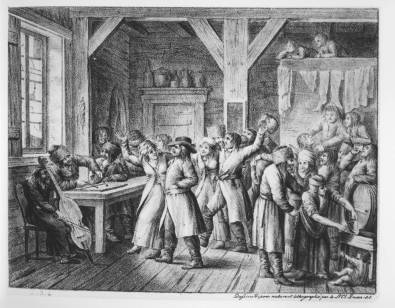 Wczesna litografia malarza Kazimierza Żwana (1792 – 1858), sygnowana Dessiné d’ après nature et lithographié par L[ieutenan]t C[olone]l Żwan 1818, przedstawia wnętrze karczmy, wypełnione wieśniakami. Pośrodku izby tańczą weselące się pary, w takt żydowskiej muzyki – cymbalisty i wiolonczelisty, siedzących przy stole. Z prawej strony kompozycji oberżystka toczy piwo z beczki. Ta nieczęsto spotykana litografia powstała, być może, w amatorskiej pracowni hrabiego Aleksandra Chodkiewicza w Warszawie. Żwan malował pejzaże i sceny batalistyczne. Zmarł w Warszawie.