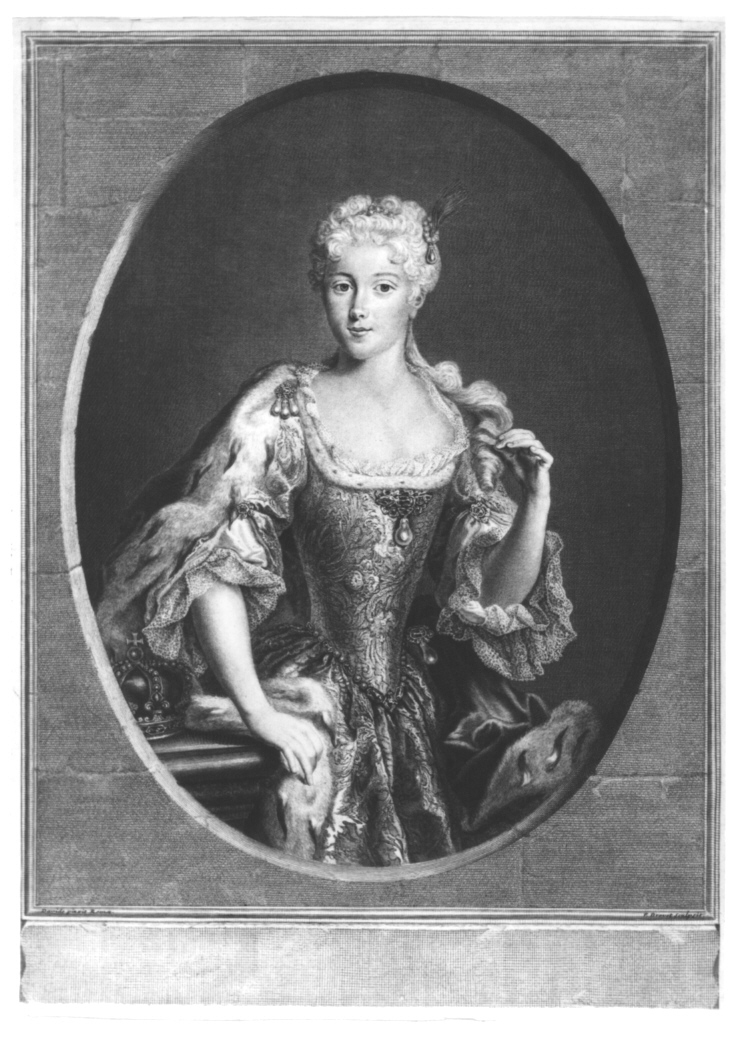 Zachowało się wiele portretów Marii Klementyny – malarskich i graficznych, w większości przedstawiających ją w blasku urody, potem całkowicie zniszczonej. Podobizny te, powstałe en masse poza Polską (głównie w Rzymie), mieszczą się w stosunkowo krótkim przedziale czasowym, ograniczonym datą zaślubin (1719) i śmierci Sobieskiej (1735). Portrety olejne, malowane zapewne na zamówienie stuartowskiego dworu, wykonywali najczęściej dwaj artyści działający w Wiecznym Mieście: cavaliere Francesco Trevisani zwany Romano (1656 – 1746) oraz Antonio David (przed 1684 – po 1735). Podobiznę Klementyny pędzla Davida utrwalił na miedzi świetny francuski rytownik Pierre – Imbert Drevet (1697 – 1739), tworząc najpiękniejszy wizerunek królowej w całej poświęconej jej grafice. Jasnowłosa, smukła dziewczyna w wydekoltowanej wzorzystej sukni, ozdobionej u gorsu przepyszną broszą z klejnotów, lewą ręką swobodnym ruchem odgarnia długi lok, spływający jej na ramię. Zwracając do widza twarz o wyrazistych oczach i lekkim uśmiechu, prawą dłoń opiera na fragmentarycznie ujętym cokole (lub stoliczku) z królewską koroną. Z ramion spływa płaszcz gronostajowy. Z portretu (jeszcze) szczęśliwej Sobieskiej emanuje świeżość, swoboda i elegancja. Opisany sztych, wykonany po mistrzowsku, powstał w latach 1723 – 1730. W polskich zbiorach nie spotyka się go często.