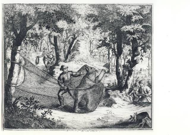 Rycina z przedstawieniem sceny w lesie. Jest to polowanie na niedźwiedzia. Mężczyzna trzyma zwierzę w siatce, w którą sie zaplątał. Po boku inny obserwuje niebezpieczną sytuację. Jest to rycina z dzieła Thomasa Salmona.