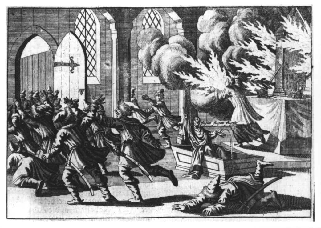 Zamieszczony w dziele Ludolfa anonimowy miedzioryt jest wierną ilustracją opisanych wyżej zdarzeń: z ust zmarłego wychodzi napis fugite fugite fugite, a z obu rąk tryska krew. Obok z przewróconych świeczników rozprzestrzeniają się jęzory ognia, ogarniając kolumny i ołtarz, od którego ucieka przerażony kapłan. W otwartych drzwiach tratuje się spanikowany tłum.