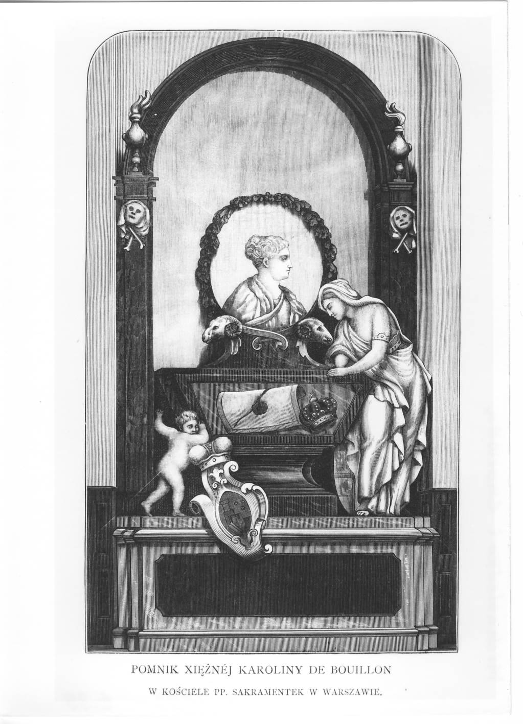 W tym ciekawym ikonograficznie pomniku, wzniesionym w 1746 r., zwracają uwagę trzy elementy: owalny marmurowy medalion z portretem „królewnisi” w prawym profilu, autorstwa Lorenza Mattiellego – rzeźbiarza nadwornego Augusta III, działającego w Dreźnie; pęknięta tarcza (herb Sobieskich Janina) oznaczająca wygaśnięcie rodu; płacząca postać kobieca – personifikacja Polski. Piękny nagrobek księżnej de Bouillon, mozolnie zrekonstruowany po poważnych zniszczeniach w ostatniej wojnie, wiele niestety stracił ze swej świetności. Całotablicowy drzeworyt Juliana Schübelera, zamieszczony w dziele Józefa Łoskiego pt. Jan Sobieski, jego rodzina, towarzysze broni i współczesne zabytki (Warszawa 1883), pokazuje pierwotny stan zabytku, należącego do najokazalszych nagrobków medalionowych w Polsce.