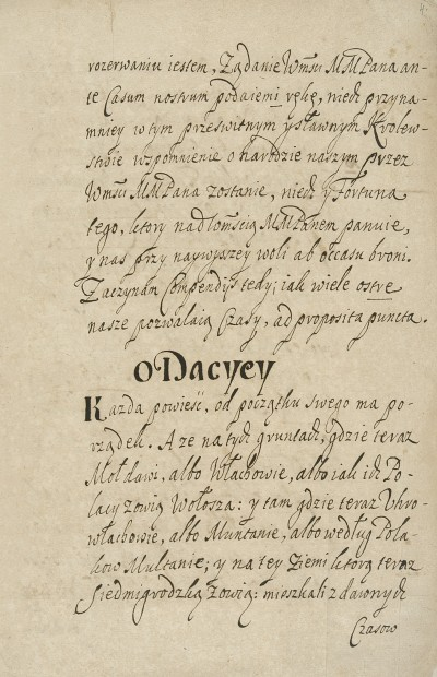 Miron Costin zaczyna swą opowieść od opisu zasiedlenia ziem rumuńskich przez Rzymian wskutek podboju Dacji przez Trajana. Czyni to nie bez kozery, gdyż pozwoli mu to dalej uzasadnić rzymski rodowód współczesnych mu „Wołochów” i mieszkających w Siedmiogrodzie „Ruminów”. Opisawszy świetność rzymskiej Dacji, Miron Costin zobrazował następnie jej podbój przez „Tatarów” – czyli różnej maści barbarzyńców, pojawiających się od III w. nad dolnym Dunajem. Autor zalicza też do nich Węgrów, jako spadkobierców Attyli, którzy jako ostatni zawojowali dawną rzymską prowincję. Jest to oczywiście prztyczek w nos wymierzony dumnym panom węgierskim pogardzającym rumuńskim „chłopstwem”. Tymczasem autor wyraźnie zaznacza, że dawni Rzymianie przetrwali w górach, z których zeszli w końcu średniowiecza i utworzyli hospodarstwa wołoskie i mołdawskie.